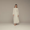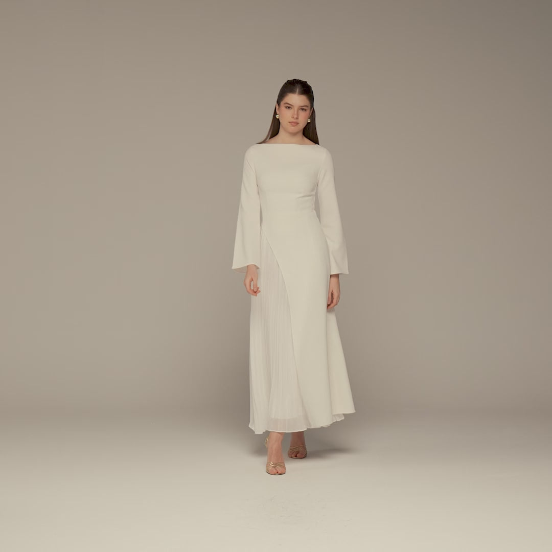 This crepe maxi dress is designed with a clean silhouette and a side chiffon pleated panel that adds movement without extra volume. The structured bodice creates a smooth fit, while the pleats soften the look and allow comfortable wear. A balanced choice for Eid occasions that need polish with ease.