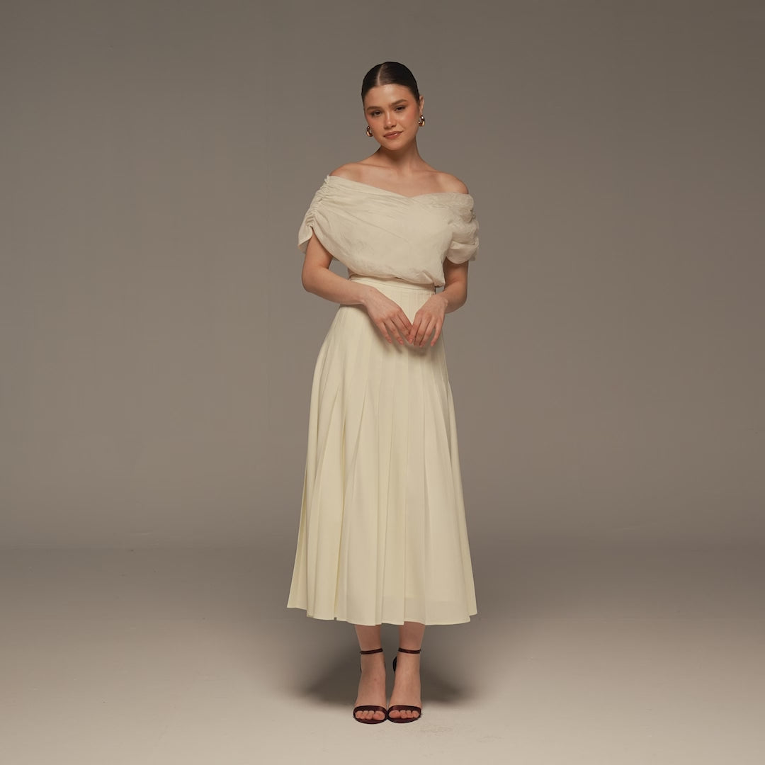 This off-shoulder organza blouse brings a light, feminine touch to evening looks without feeling overdone. The soft wrap-style neckline sits gently on the shoulders, adding shape while allowing comfortable movement. A refined piece that works well for dinners, events, or styled separates.