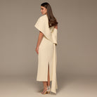 This one-shoulder crepe dress features soft draping that creates shape without feeling restrictive. The asymmetrical cut draws the eye upward and balances the silhouette, while the smooth crepe fabric falls cleanly over the body. An easy yet polished option for Eid occasions that call for a refined look with subtle detail.