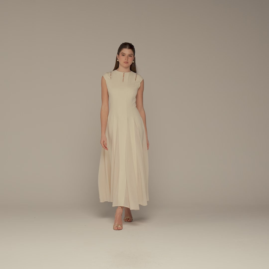 This ivory crepe maxi dress is crafted from smooth, structured fabric that holds its shape while feeling light to wear. Chiffon inserts in the skirt add soft movement as you walk, while the pearl-accent cutouts at the neckline bring a refined detail without feeling overdone. Ideal for evening occasions, formal events, and special celebrations where you want a graceful, balanced look.