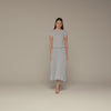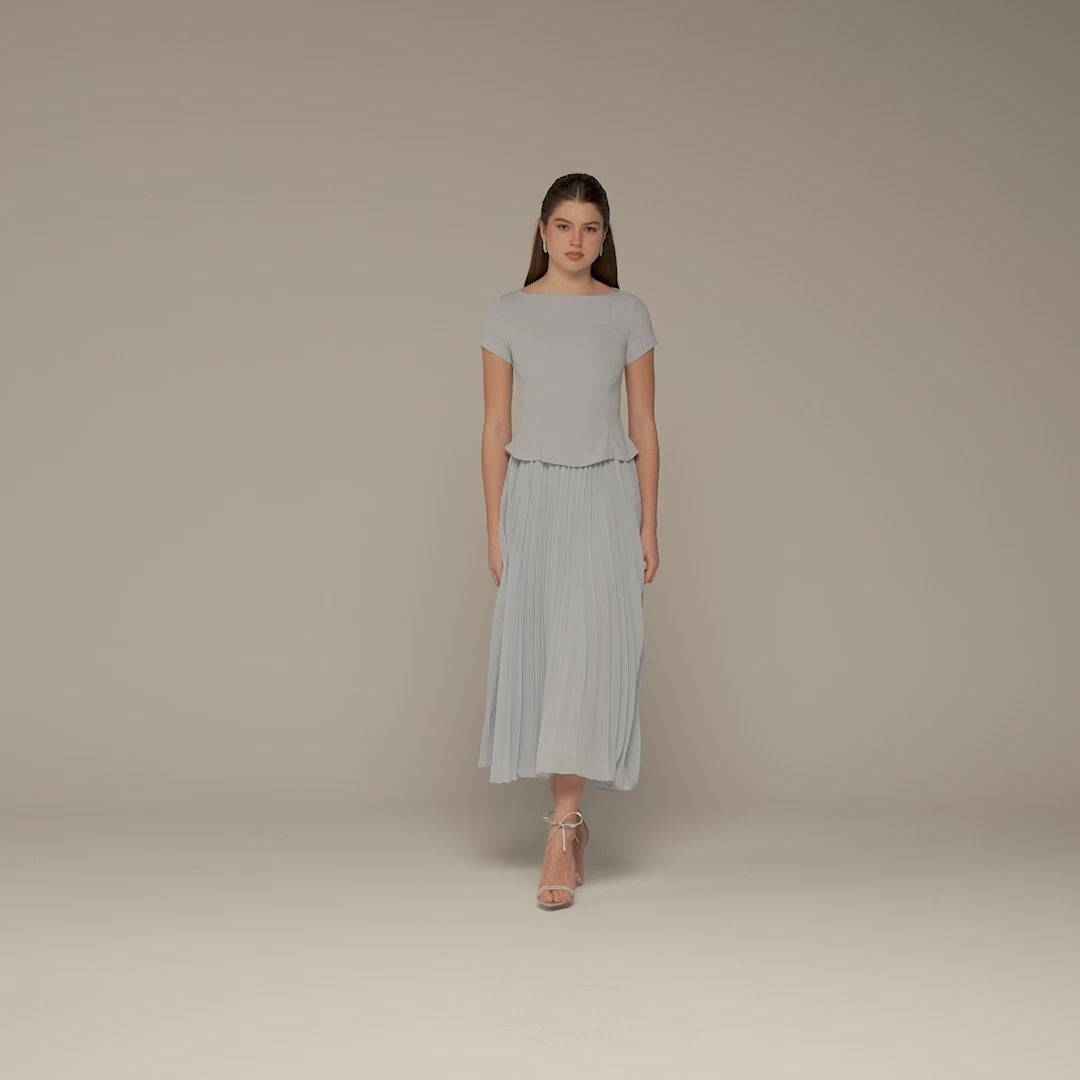 This light blue dress combines a structured crepe top with a softly pleated chiffon skirt for a balanced, easy-to-wear silhouette. The short sleeves offer coverage without feeling heavy, while the pleats add movement that stays light throughout the day. A calm, polished choice for Eid gatherings and daytime occasions.