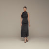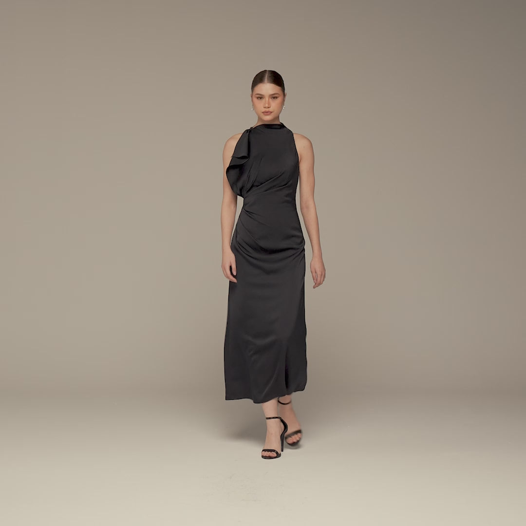 This maxi dress is crafted from smooth crepe satin that flows softly and feels comfortable on the body. The draped panel adds movement and gentle shape, creating a flattering look without clinging. A refined choice for weddings, evening events, or occasions where you want an elegant yet easy silhouette.