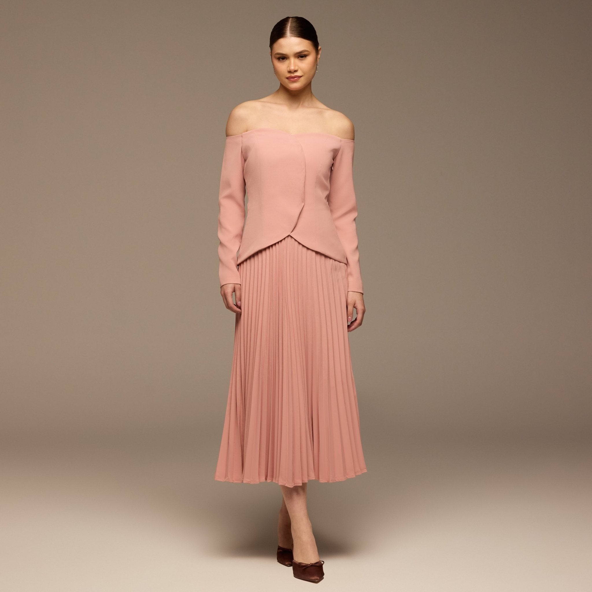 This maxi dress pairs a structured crepe top with a soft pleated chiffon skirt for a balanced look that feels polished yet light. The fitted bodice defines the waist, while the flowing skirt moves easily, making it a comfortable choice for long Eid gatherings.