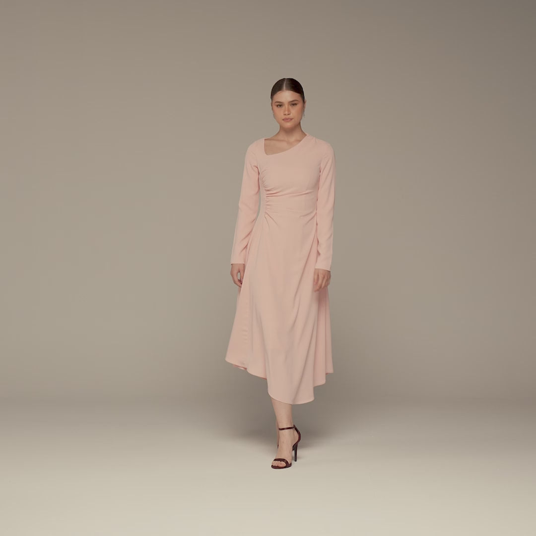 This side-ruched crepe midi dress is designed to flatter without feeling restrictive. The gathered detail at the side draws attention inward, creating a more defined waist while keeping the fit comfortable. With its smooth drape and long sleeves, it’s an easy choice for occasions that call for polish and ease in one look.