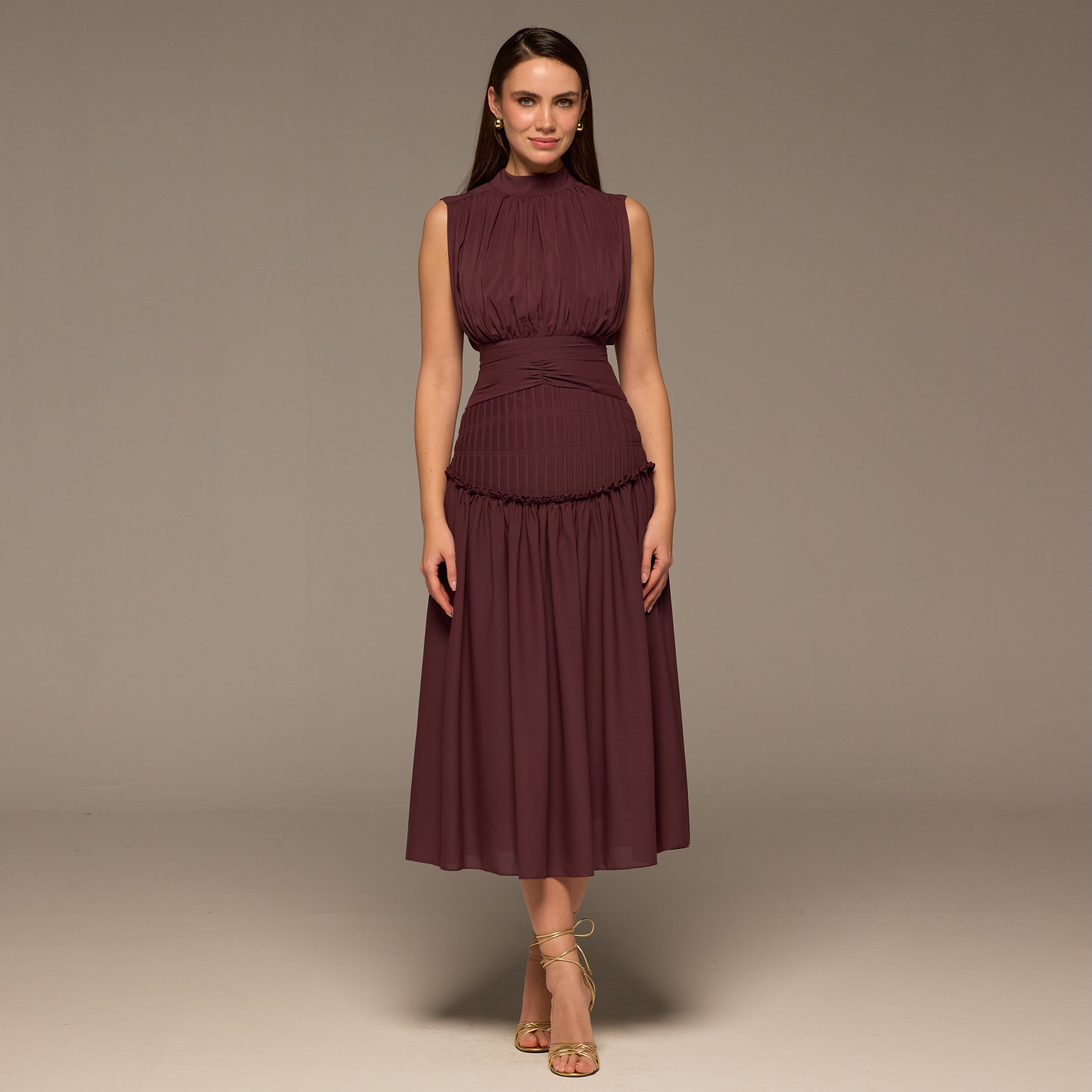 This chiffon midi dress brings a light, graceful flow with its flared skirt and soft pleats at the chest. The mock neck adds a refined touch, while the fitted waist with a back tie shapes the silhouette without sacrificing comfort. Sleeveless design keeps it airy, making it ideal for warm gatherings and semi-formal events.
