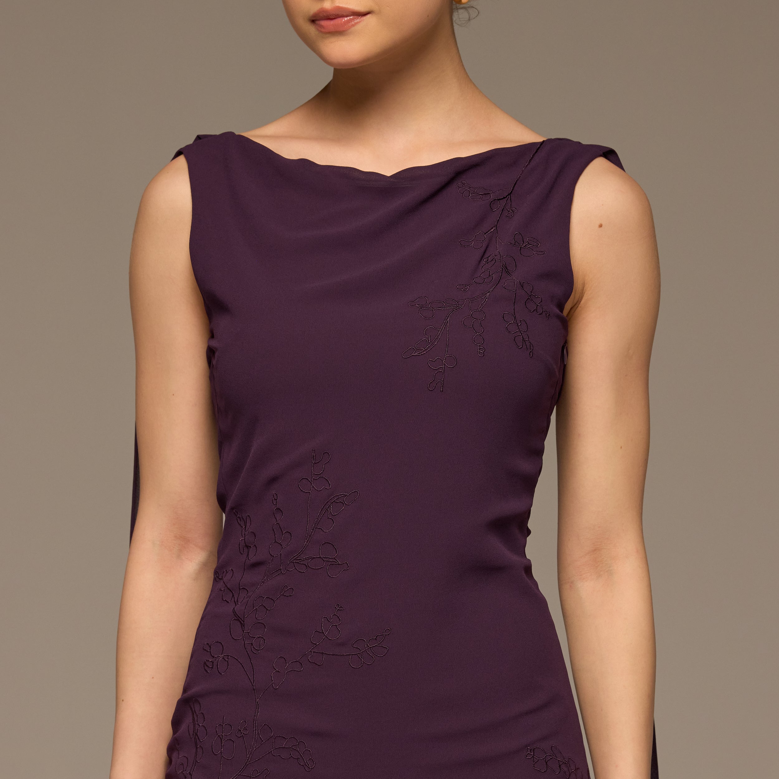 This sleeveless chiffon maxi dress has a soft, feminine feel. It features delicate floral embroidery and a flowing pleated skirt that moves beautifully as you walk. The draped neckline adds softness to the look, while the low back with two flowing ties brings a graceful finishing touch.