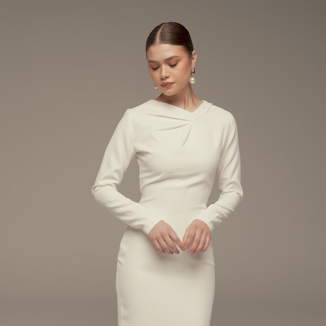 This white crepe dress features a softly twisted neckline that draws the eye upward, finished with a delicate pearl detail for a clean, refined look. The smooth crepe fabric falls straight on the body, offering comfort and a polished shape without feeling restrictive.