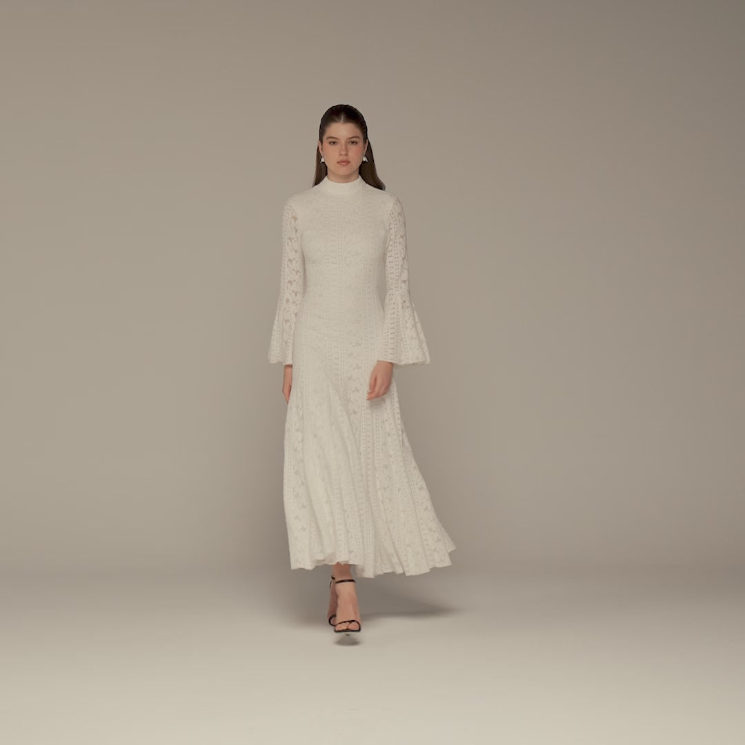 This white lace maxi dress balances coverage with subtle detail, featuring a high neckline and softly flared sleeves that add movement without excess. The fitted bodice shapes the waist, while the lace fabric keeps the look light and comfortable. A refined option for Eid gatherings and daytime occasions that call for elegance without effort.