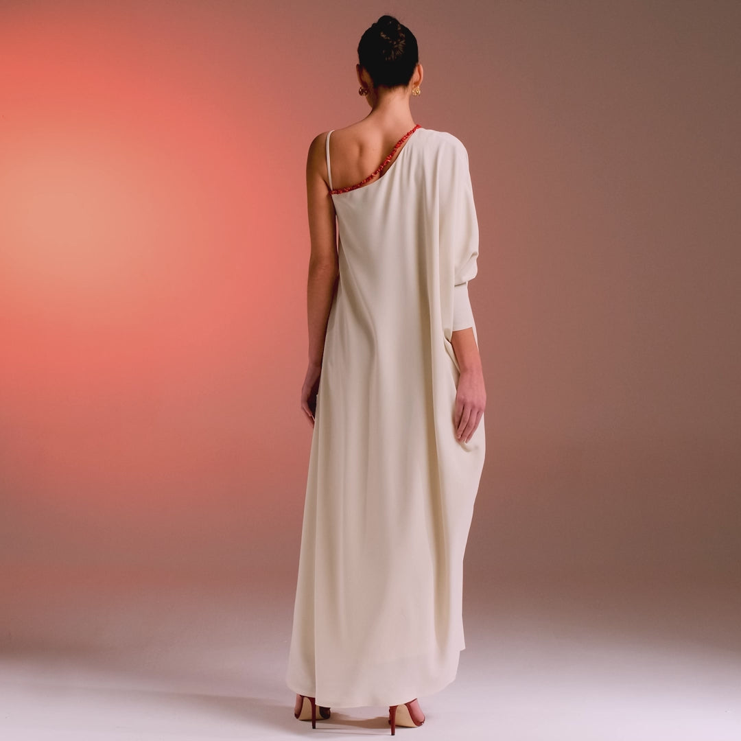 Beige One Shoulder Long Sleeve Crepe Kaftan