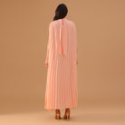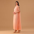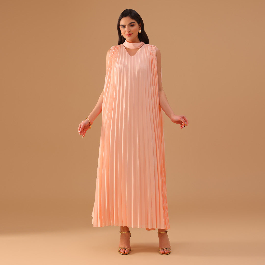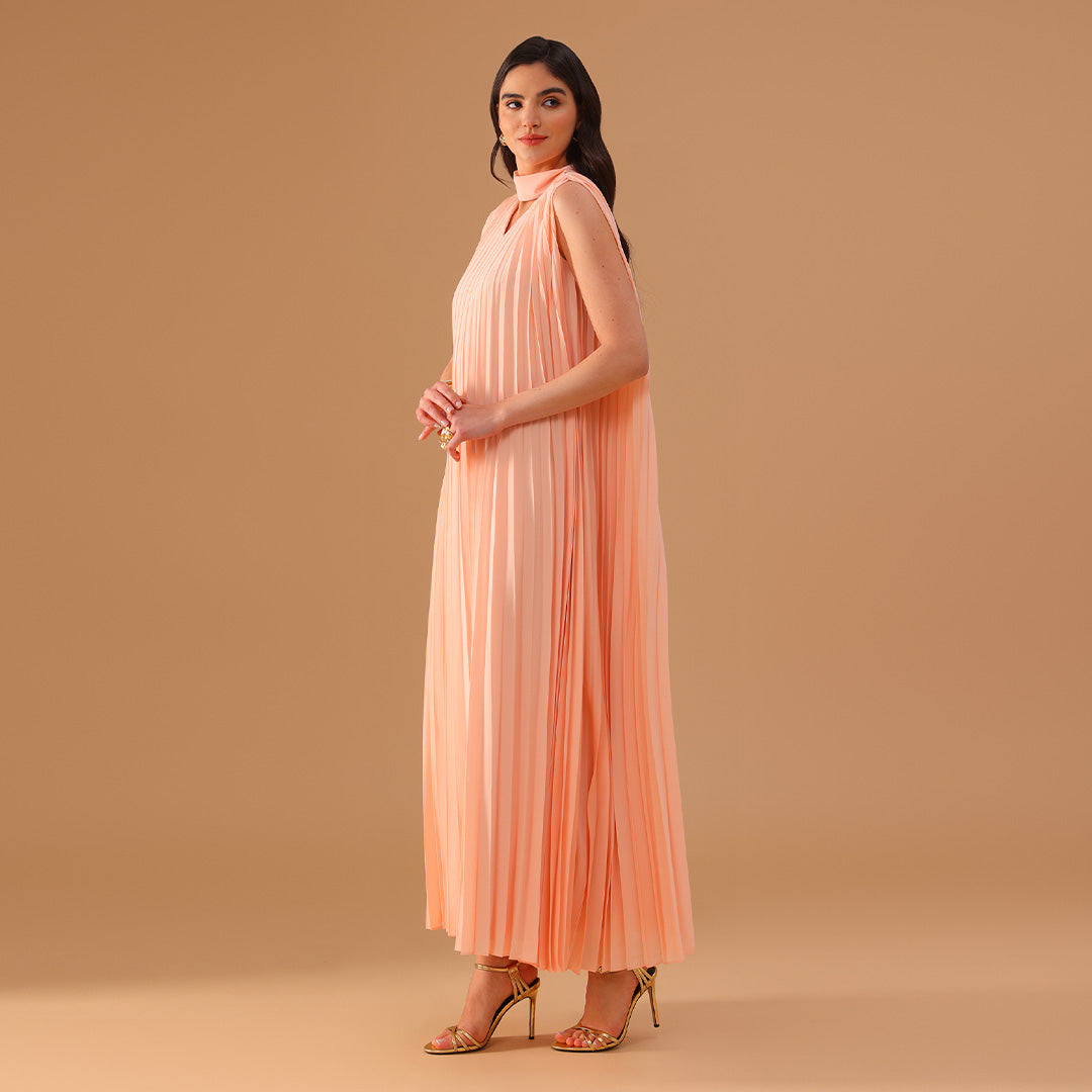 This sleeveless chiffon dress is designed with soft pleats all over, giving it graceful movement and a light, airy feel. The mock neckline ties elegantly at the back while creating a subtle V-shaped cutout, adding a refined touch. Its loose fit makes it comfortable for warm-weather occasions, from daytime gatherings to evening events.