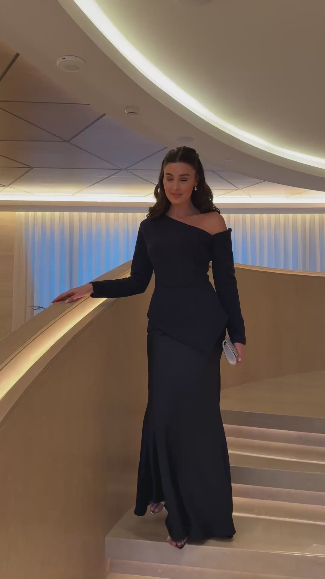 This asymmetric neckline tweed-satin dress blends texture and elegance effortlessly. The tweed top adds structure, while the soft satin skirt flows beautifully with every step. Designed with a fitted waist and flared skirt, it gives shape without feeling restrictive – ideal for special dinners or formal gatherings.