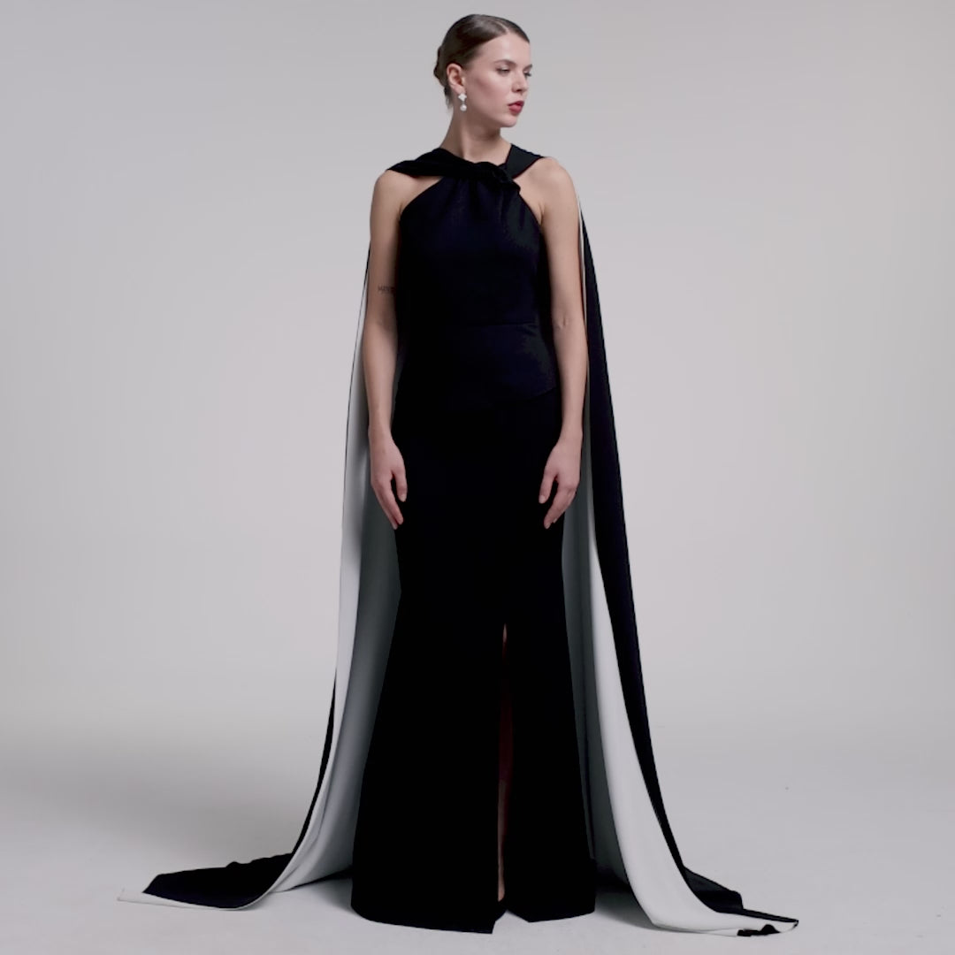This black and white gown makes an impact with its twist neckline that flows into a dramatic floor-length cape. The fitted bodice shapes the figure, while the side front slit adds ease of movement and a touch of allure. Designed for evenings where you want to stand out effortlessly, it pairs elegance with a contemporary edge.