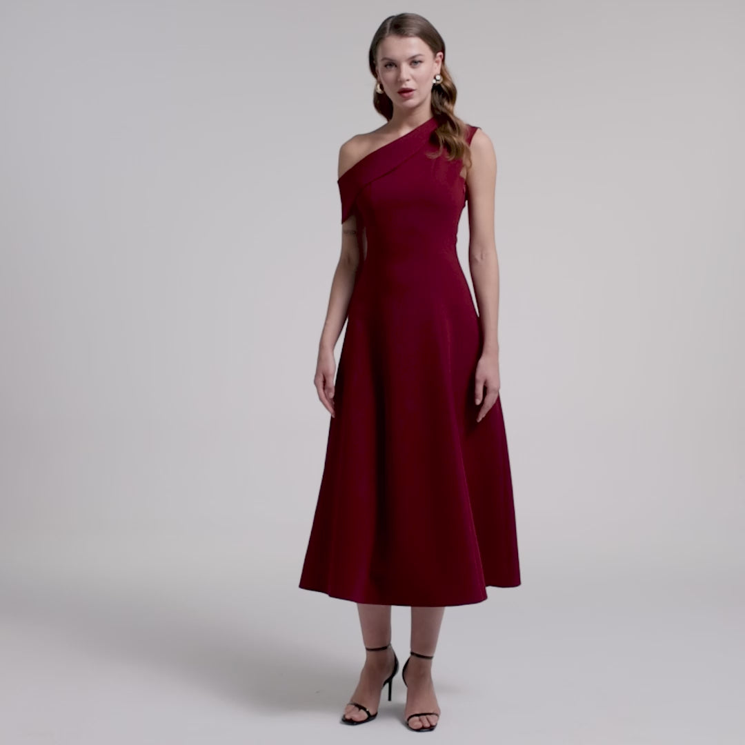 Make a statement in this Burgundy Crepe One-Shoulder Dress, designed for the ultimate evening elegance. Crafted from smooth crepe fabric, it features a stylish asymmetrical neckline that beautifully accentuates the shoulders. The fitted bodice flows gracefully into an A-line silhouette, creating a flattering, sophisticated look. Ideal for formal events, this dress combines modern style with timeless allure.