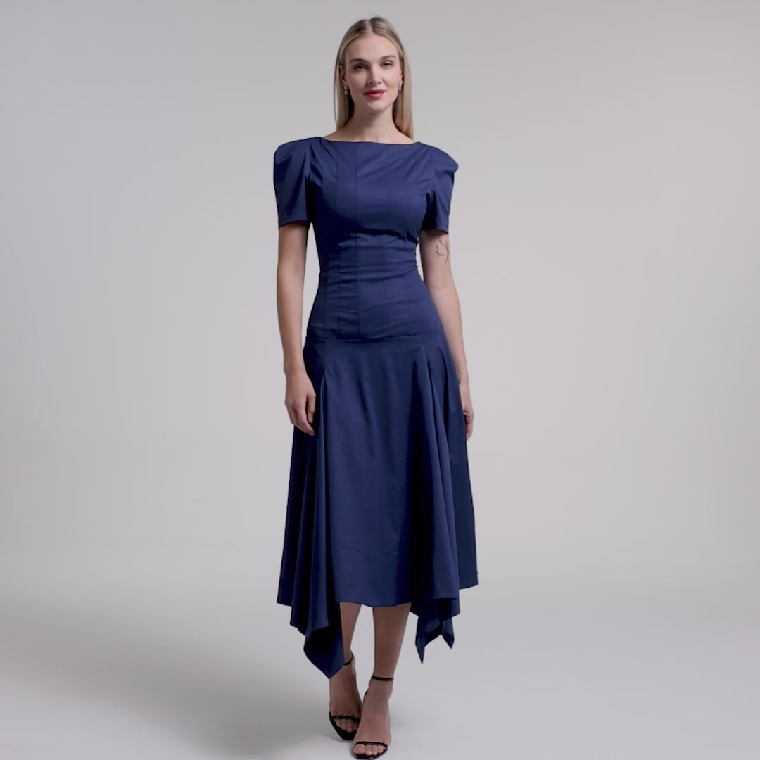 This twill midi dress is designed with a fitted waist that defines your shape without feeling restrictive. The short sleeves and boat neckline offer clean structure, while the A-line skirt and asymmetric hem give just enough movement to feel easy yet elevated. Perfect for semi-formal events when you want comfort and polish in one look.
