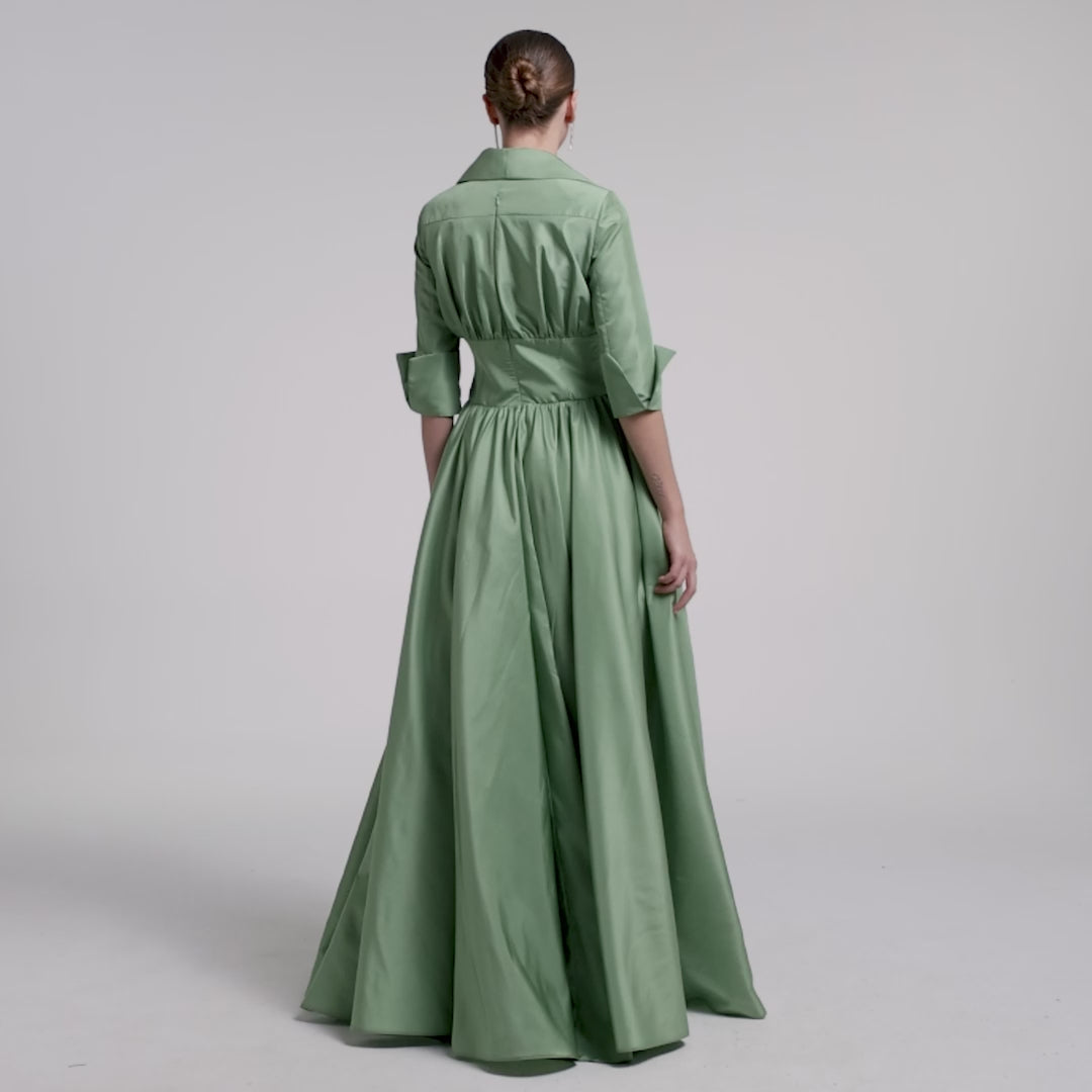 This taffeta blazer gown redefines evening elegance with a tailored twist. Featuring a structured blazer-inspired top with a rounded collar and subtle gathers at the chest, it transitions into a floor-length A-line skirt that flows effortlessly. The fitted waist enhances shape while keeping the look polished and sophisticated, making it a refined choice for gala dinners, cultural celebrations, or formal receptions.