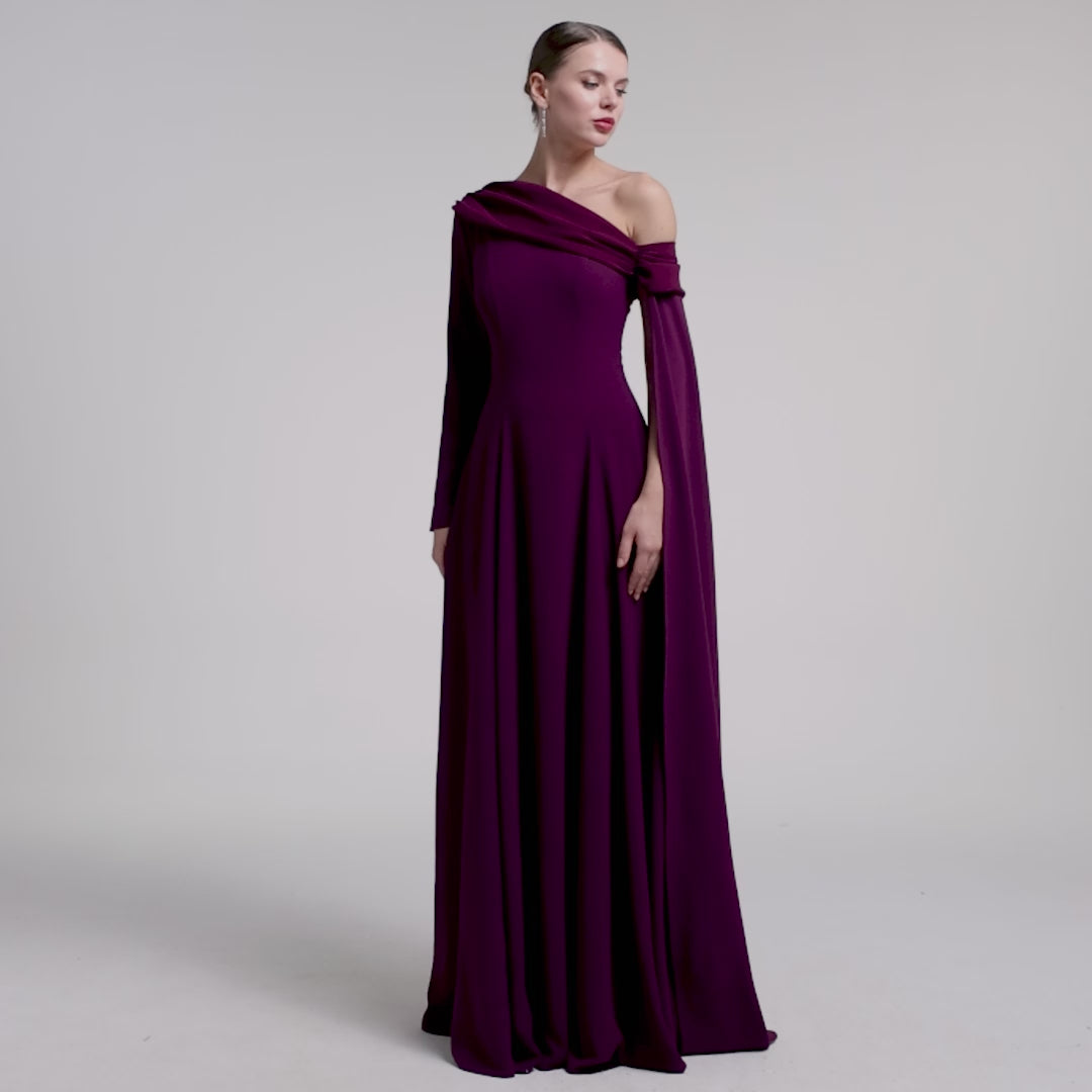 Elevate your evening look with this sophisticated plum one-shoulder gown, crafted from premium crepe fabric in an opulent plum shade. Featuring an elegant draped design across the bodice and a floor-length silhouette, this dress exudes timeless glamour. The asymmetrical neckline and long sleeve add a modern touch, while the soft crepe material ensures a flattering and comfortable fit. Perfect for formal occasions, galas, and special events, this gown will make you the center of attention.