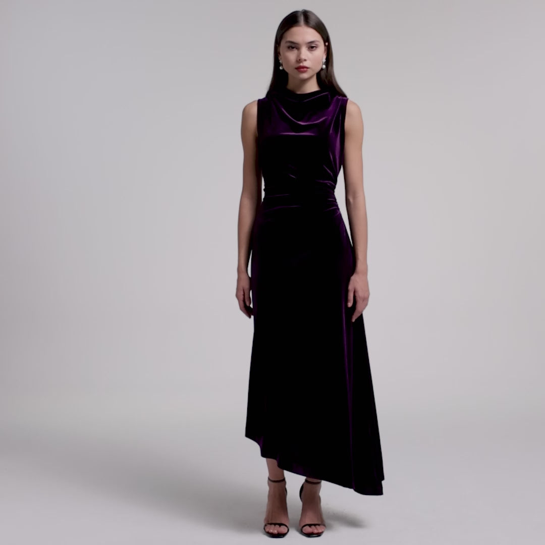 Purple Velvet Midi Dress With Asymmetric Skirt