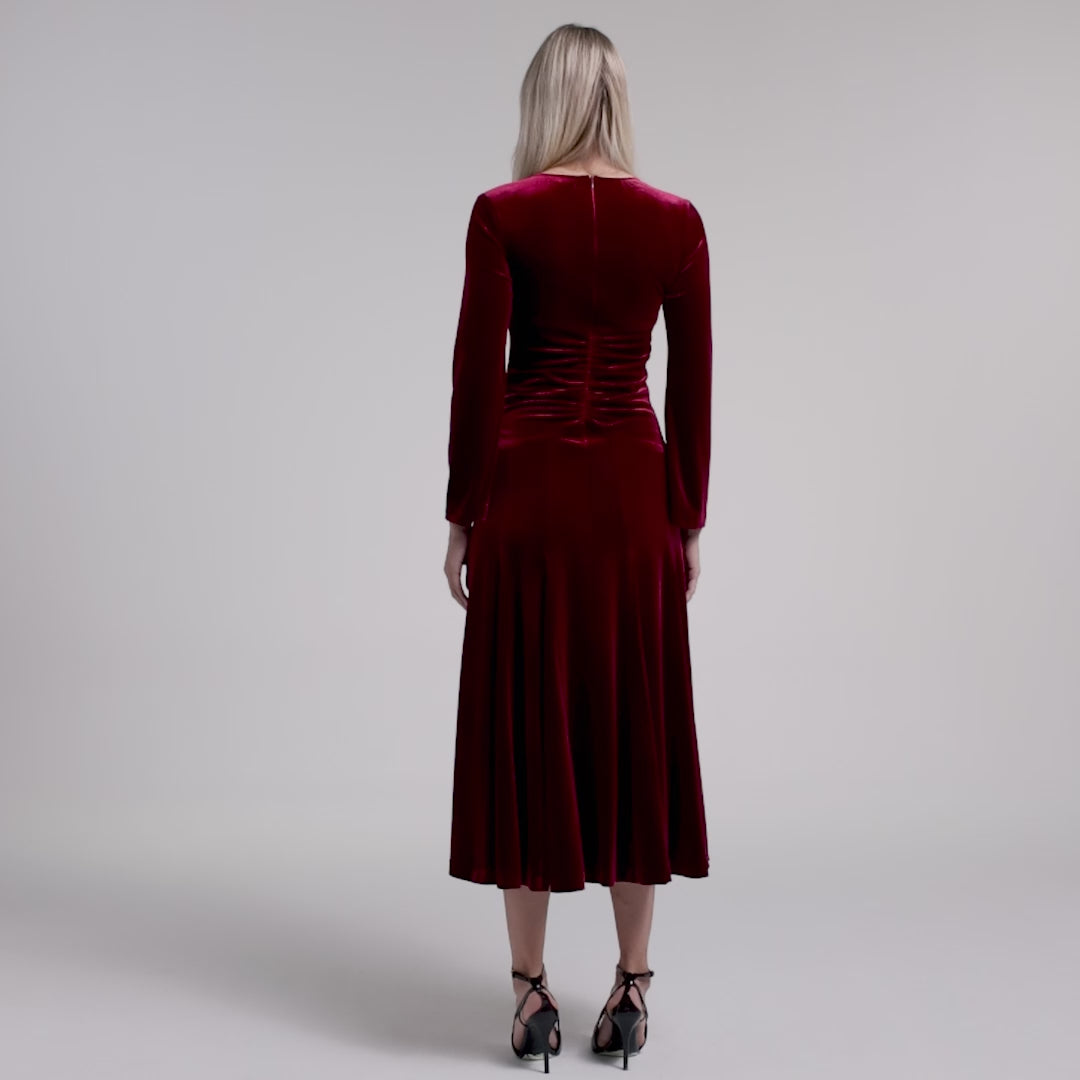 Crafted from soft stretch velvet, this maxi dress is designed with gathered waist details that create natural shape without feeling restrictive. The A-line skirt flows with every step thanks to same-fabric godets, while the bell sleeves add a slight flare to the overall look.