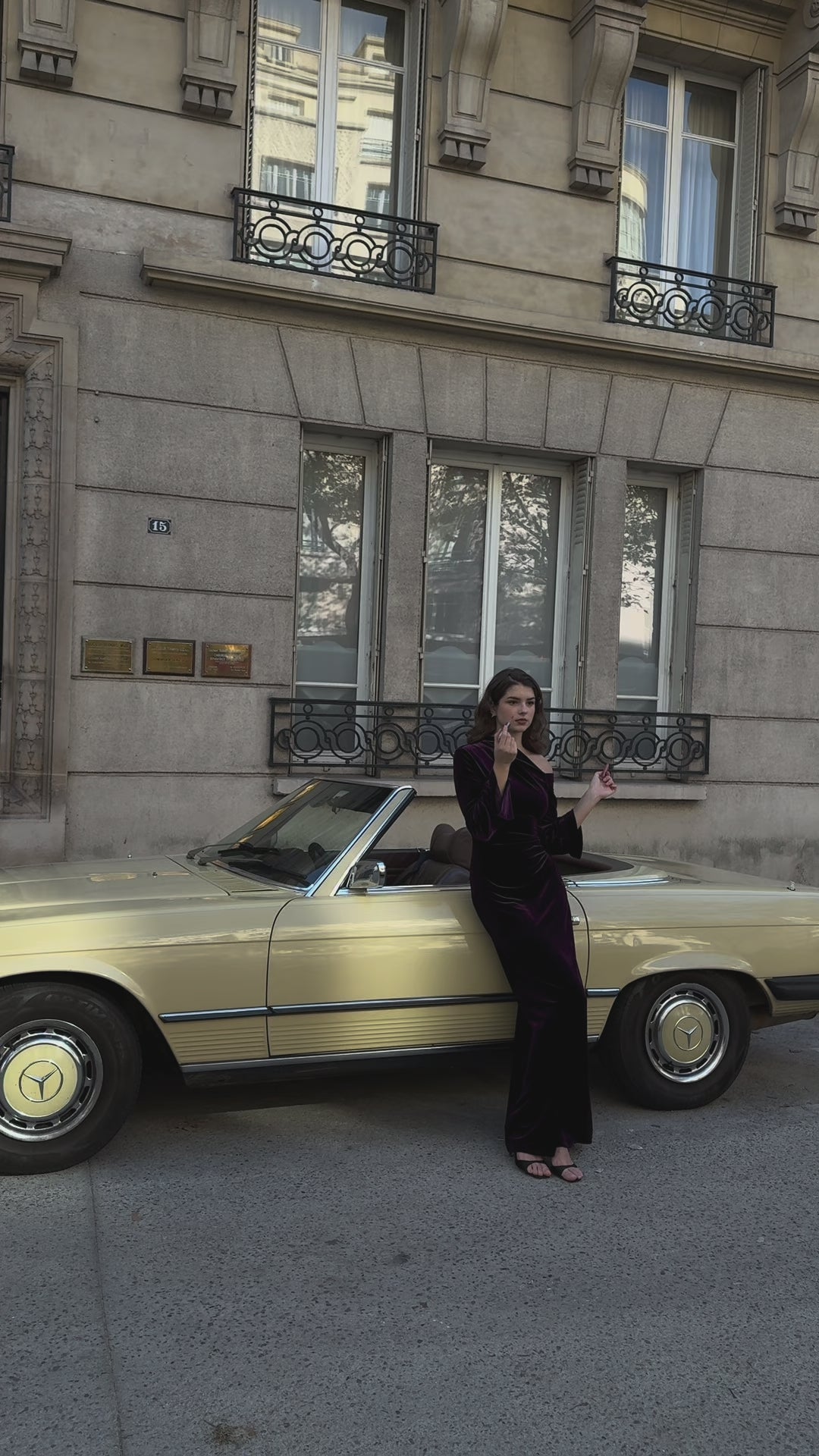 This velvet maxi dress combines a sleek straight cut with the elegance of a draped neckline that falls into one bare shoulder. The fitted waist enhances the figure, while the soft bell sleeves add a refined touch. Ideal for evening gatherings where sophistication meets comfort.