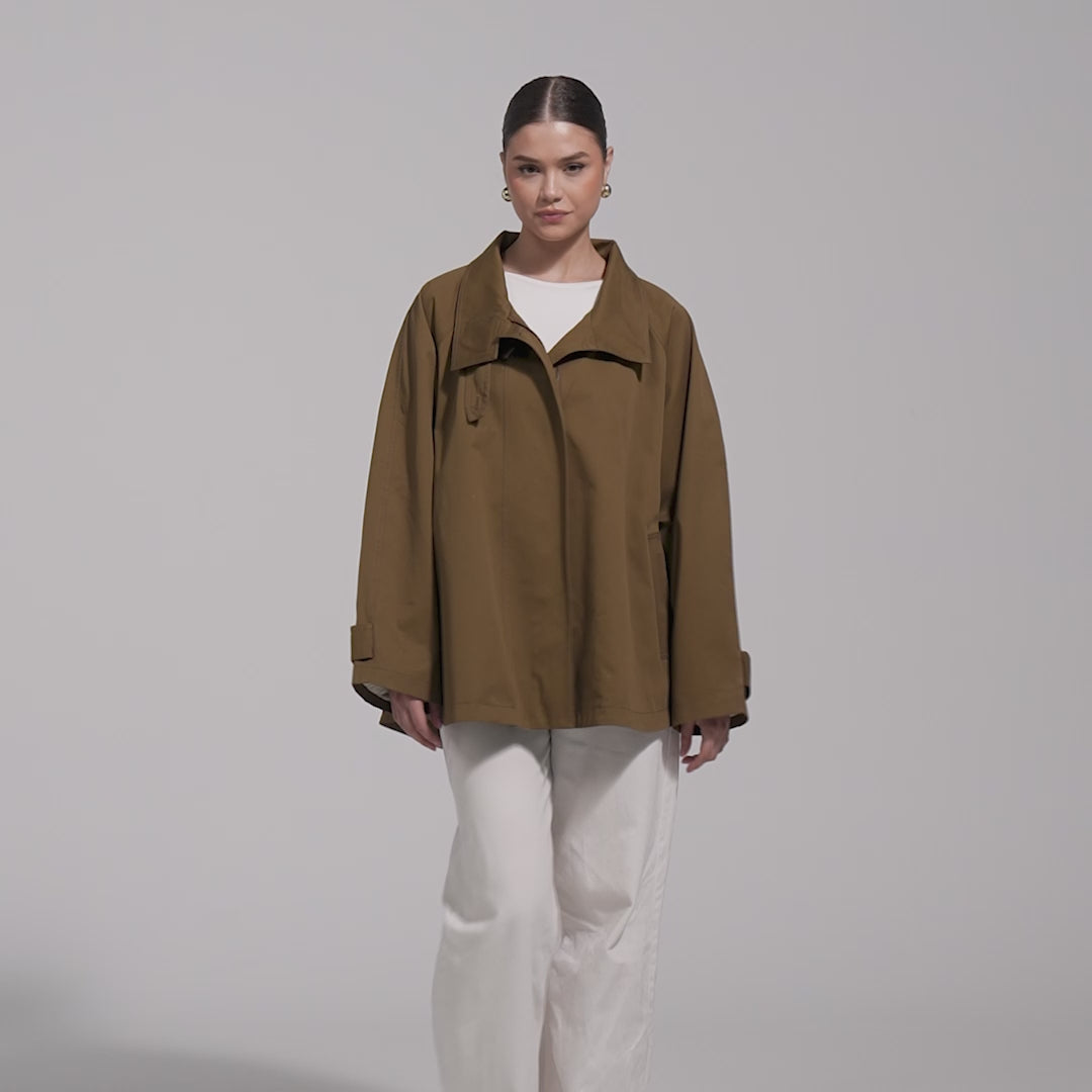 This camel twill cape trench coat is designed with a relaxed cape silhouette that drapes softly over the shoulders. Made from smooth twill fabric, it offers ease and coverage, making it a practical outer layer for everyday wear.