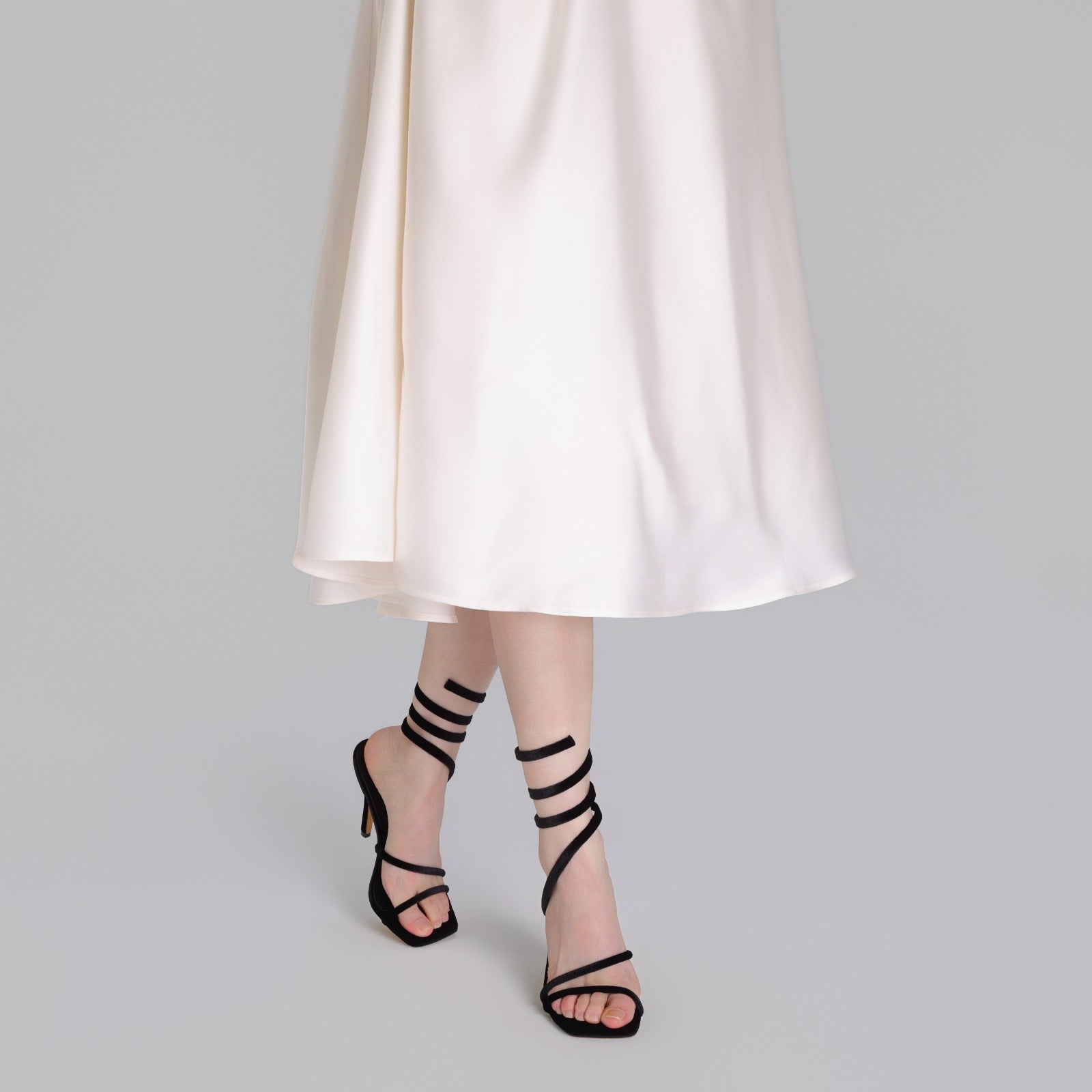 Crafted from plush velvet, these spiral-strap high heel sandals bring a striking twist to evening style. The wrap-around design embraces the ankle gracefully, while the soft velvet finish adds depth and texture. Designed to stand out, they’re perfect for nights when you want your look to make an impression.