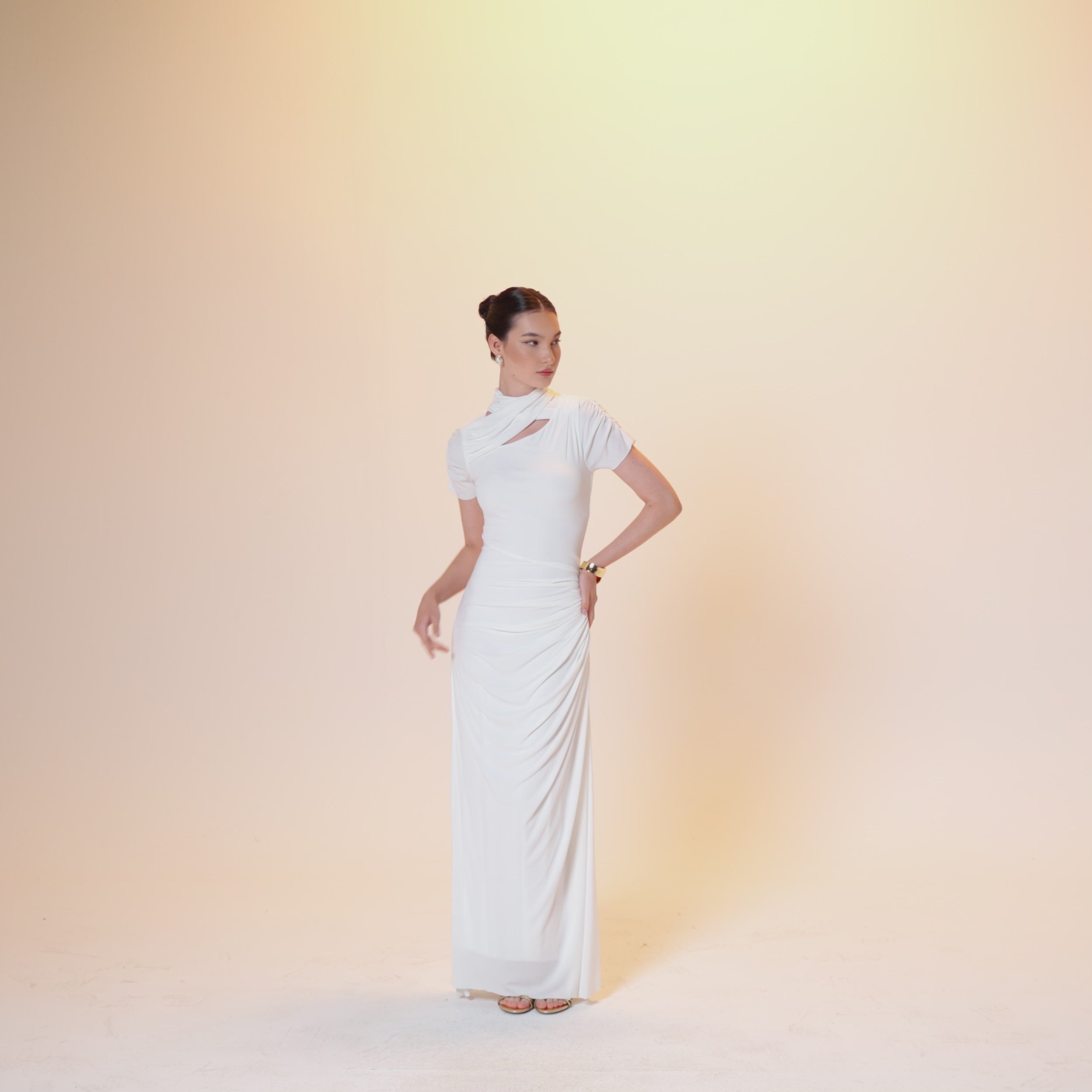 Thoughtfully placed gathers across the chest and waist sculpt the figure without restricting it, while the stretch jersey fabric ensures ease with every movement. The short sleeves add structure, and the neckline’s directional draping gives a refined finish. Ideal for women who want coverage without bulk, and comfort without compromising elegance.