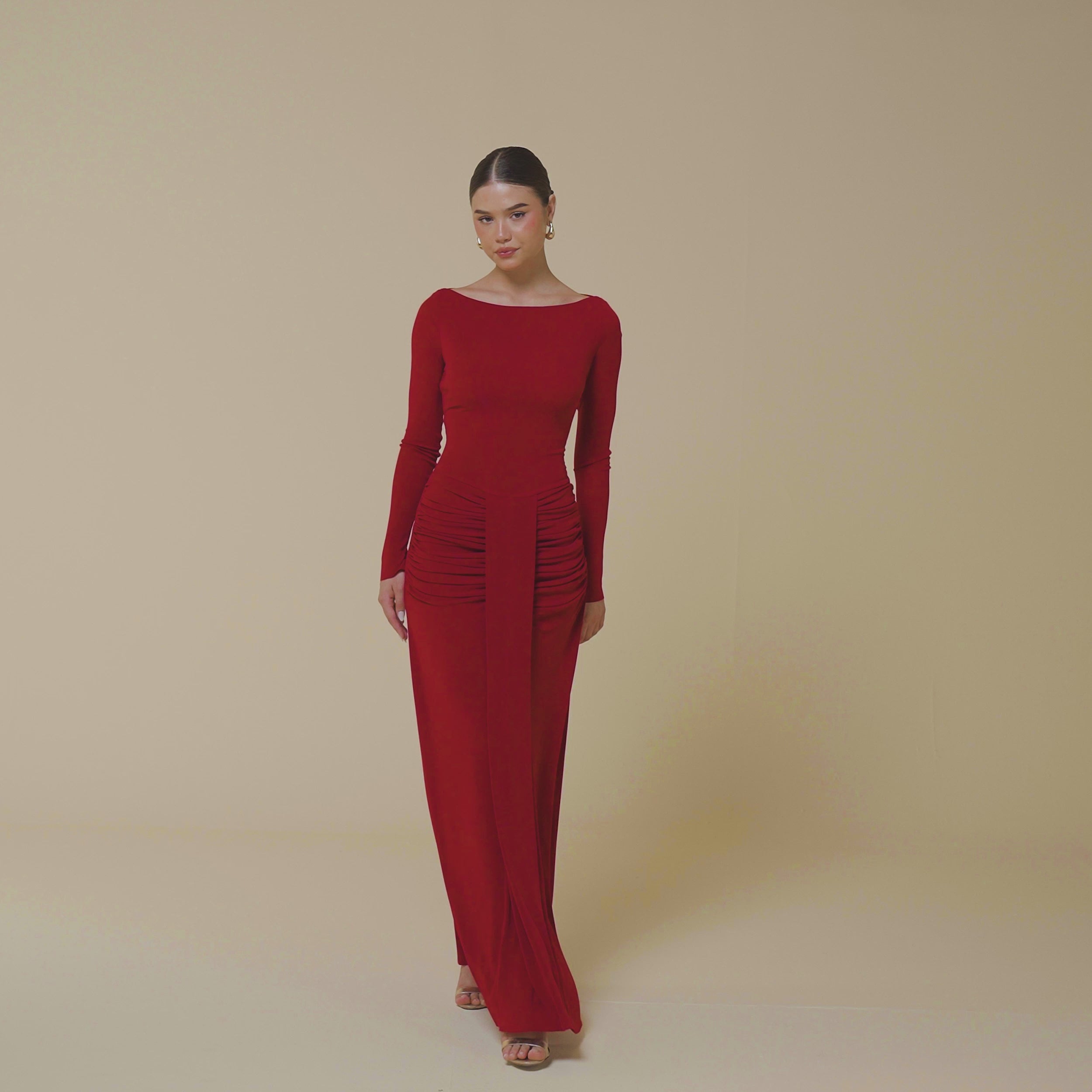 A minimal silhouette that highlights form through function. This jersey maxi dress features a gathered waist to softly define the midsection without clinging, while the long sleeves and boat neckline offer full coverage with balance. The stretch of the fabric makes it ideal for extended wear, day to evening, with ease and confidence.