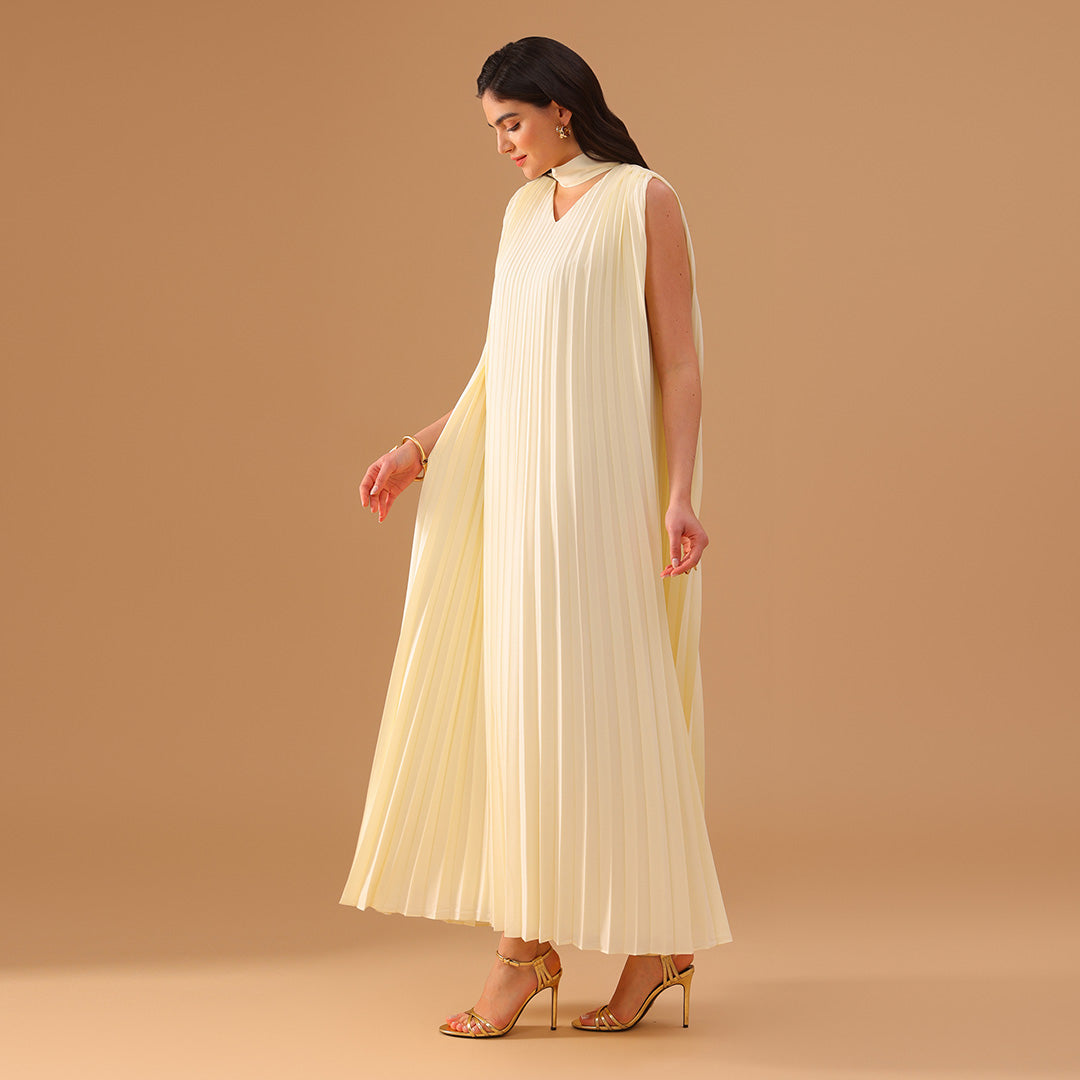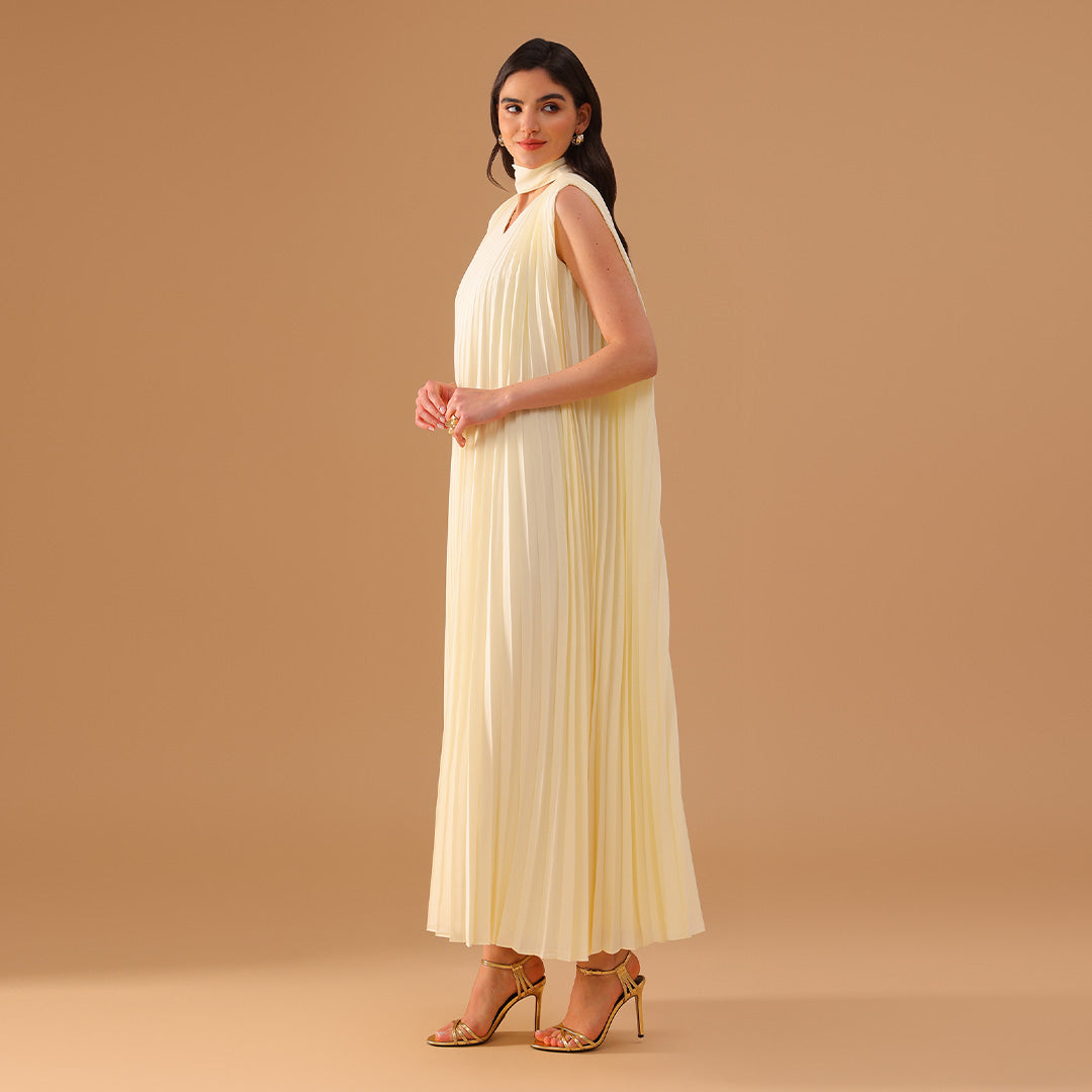 This sleeveless chiffon dress is designed with soft pleats all over, giving it graceful movement and a light, airy feel. The mock neckline ties elegantly at the back while creating a subtle V-shaped cutout, adding a refined touch. Its loose fit makes it comfortable for warm-weather occasions, from daytime gatherings to evening events.