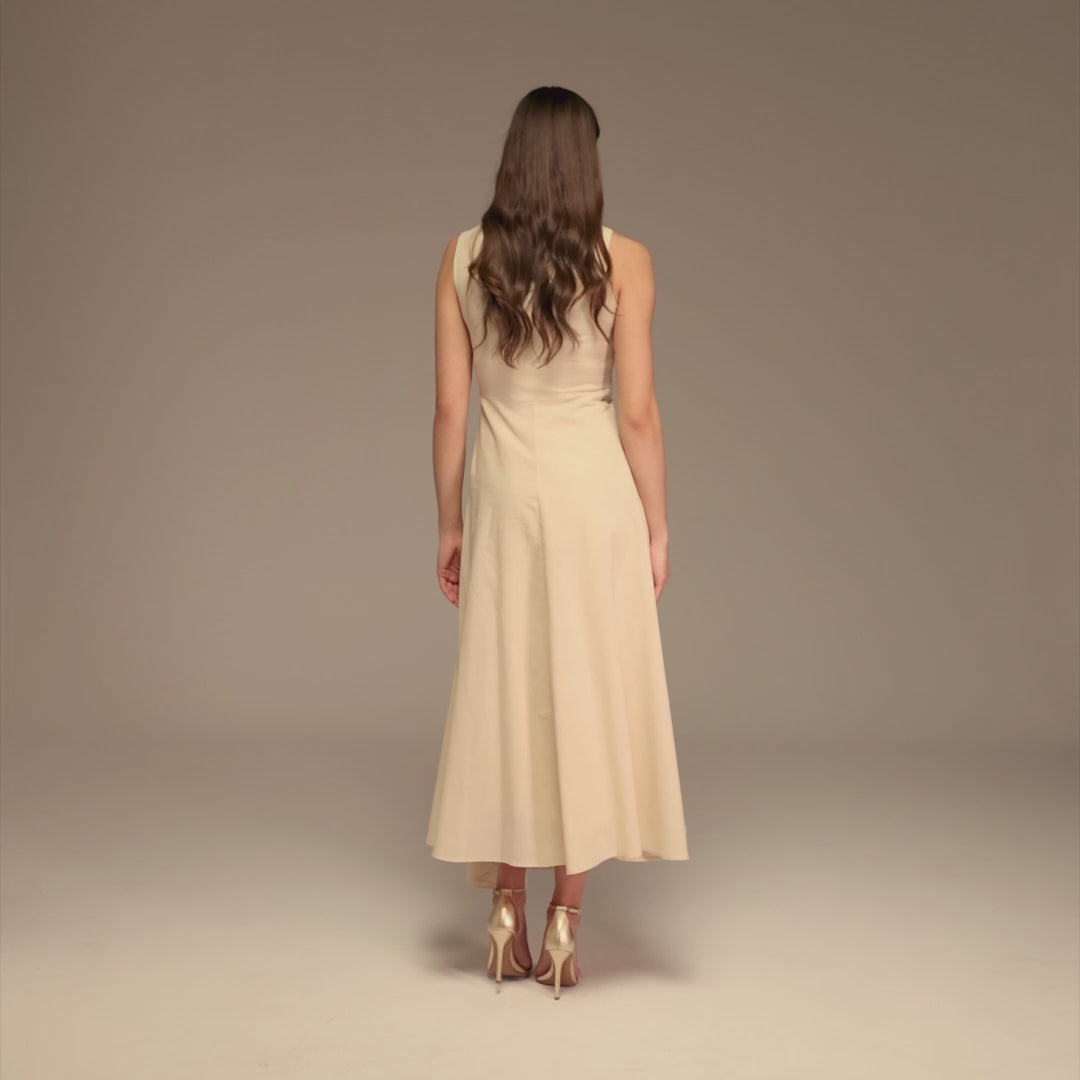 Made from breathable cotton-linen, this sleeveless midi dress features small knotted details on the neckline and waist that add texture without bulk. The soft cut-out just under the neckline introduces a light contrast, while the high-low hem and flared silhouette create natural movement.