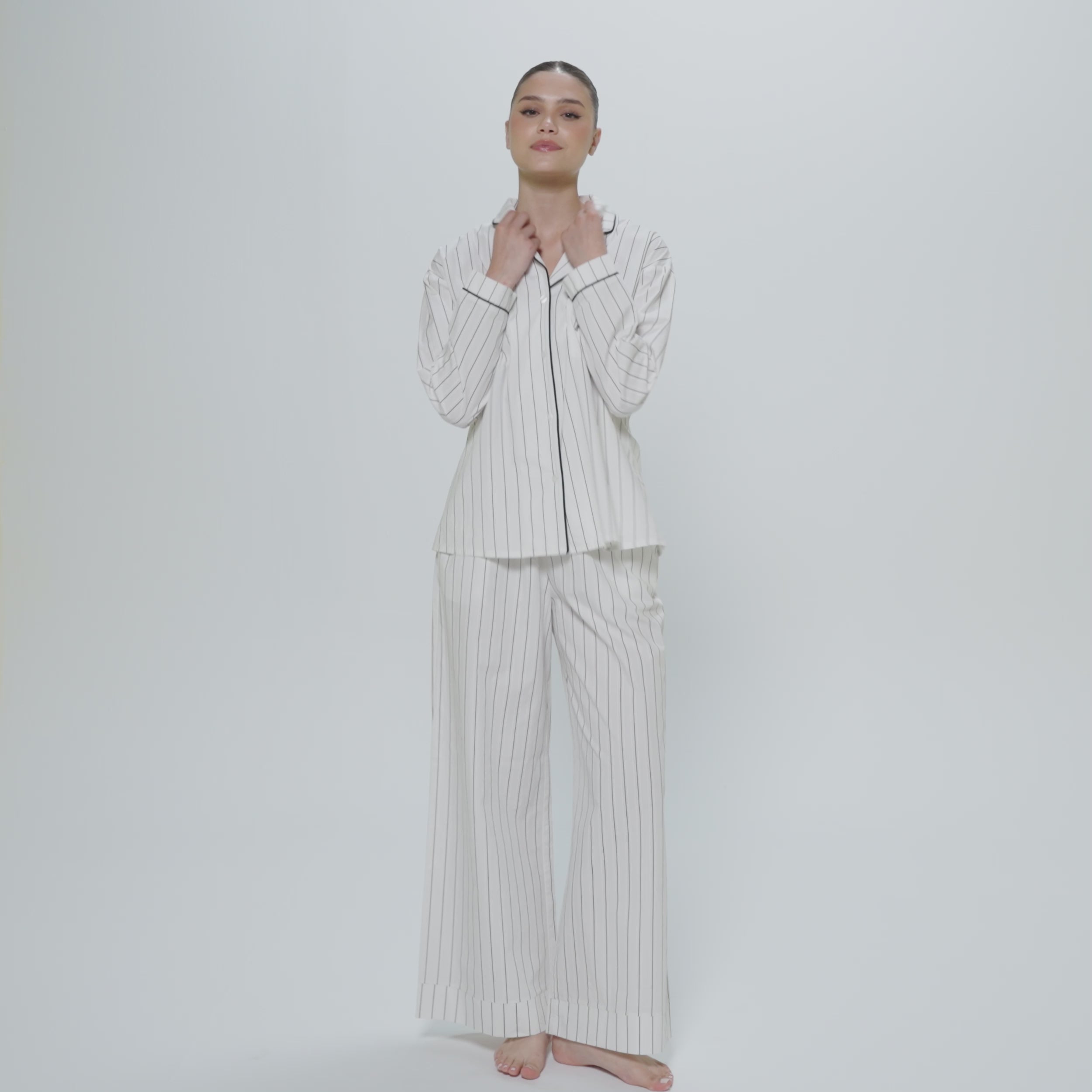 The Cotton Stripe Shirt with Embroidered Pocket from our Lounge Collection. Featuring a notched collar, piping accents, and a button closure, this shirt is completed with a chest pocket detailed with delicate embroidery.