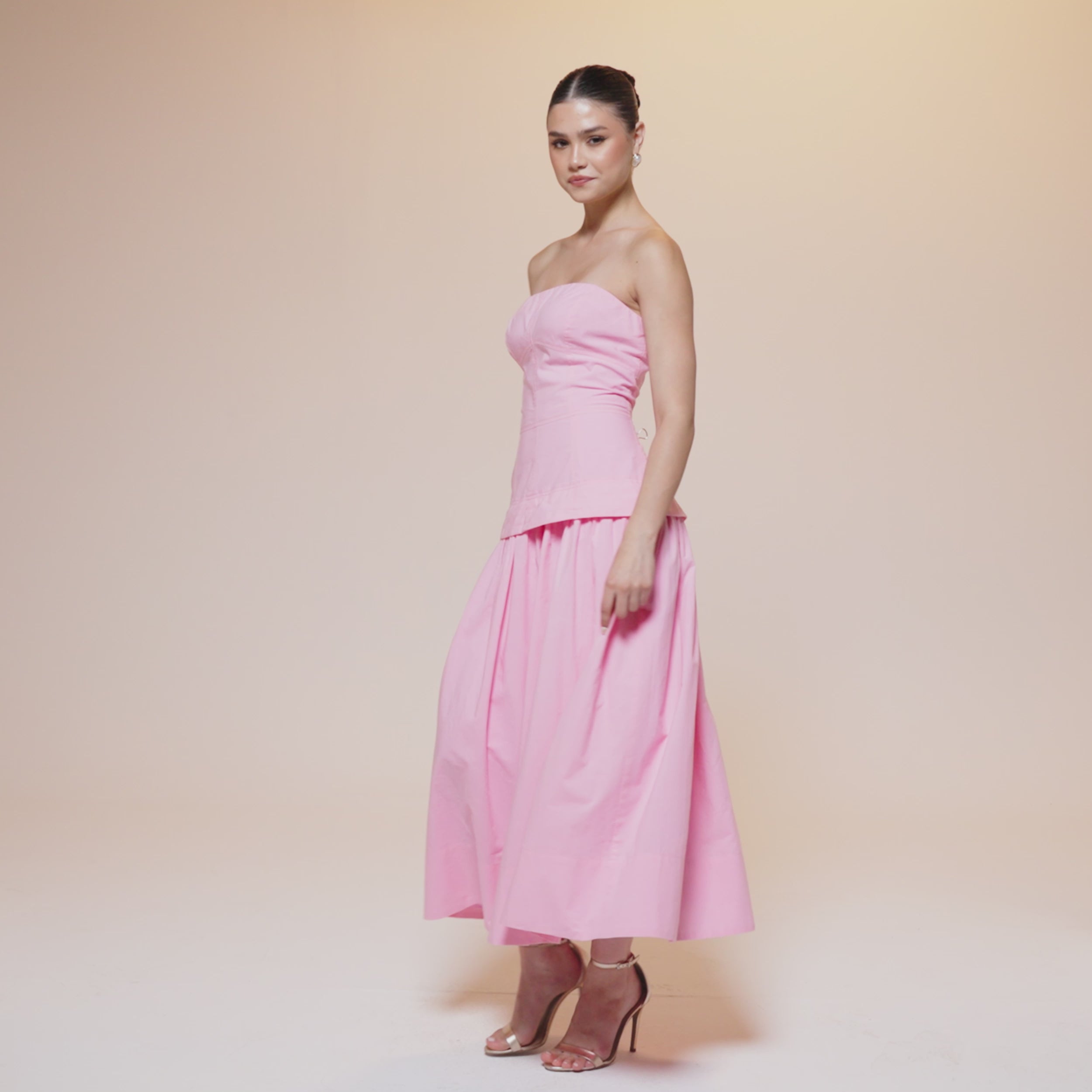 The Linen Blend Strapless Corset Cut Midi Dress in Rose from our Summer 2025 Collection. Crafted from a breathable linen blend, this soft corset-style dress features a structured bodice, a flattering high waist, and a flowing midi skirt made for warm days and sunset strolls.