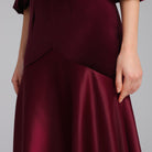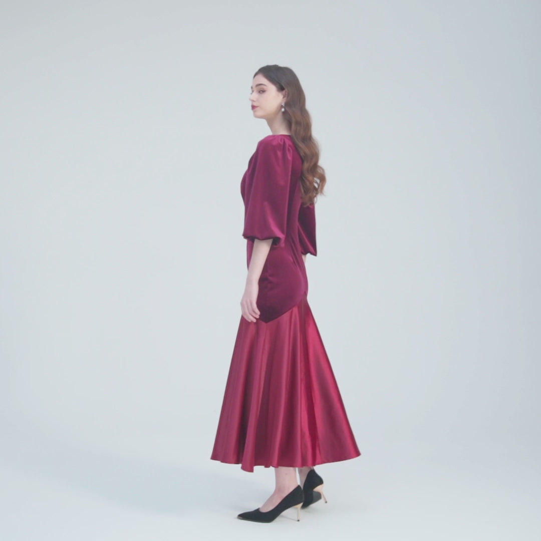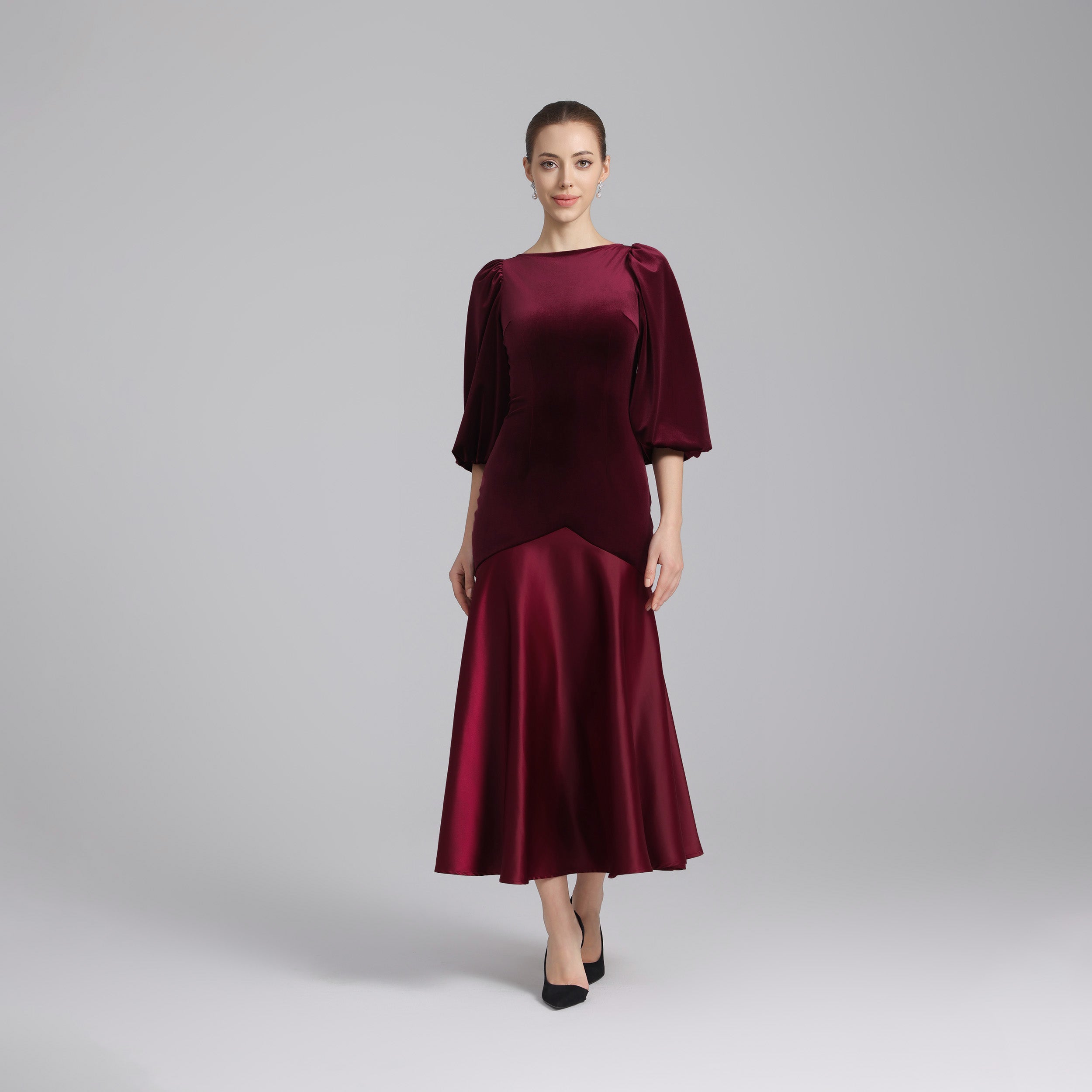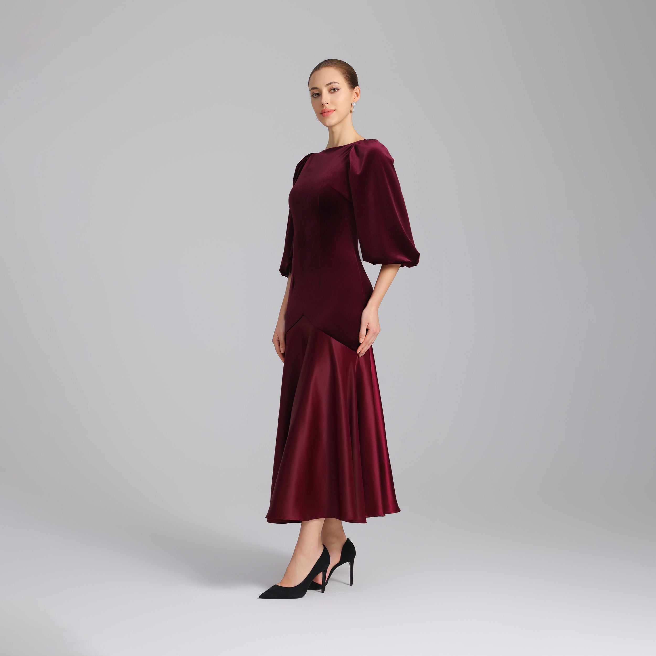 Burgundy Velvet-Satin Balloon Sleeve Midi Dress