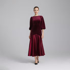 Blending soft volume with sculpted shape, this midi dress features a stretch velvet bodice and contrast satin skirt that begins at the hip for a clean separation of textures. The round boat neckline and balloon-style long sleeves provide coverage with modern elegance, while the flared satin skirt ensures ease of movement and balanced proportion. Ideal for women seeking a modest silhouette that still feels updated and refined.