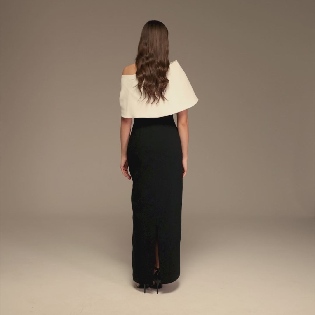 Cut from smooth crepe, this bare-shoulder maxi dress features a clean, structured silhouette with a soft drape across one shoulder. The fitted waist gives shape without feeling restrictive, and the straight skirt is finished with a back slit for comfort when walking. It’s elegant without trying too hard, perfect for evening occasions that call for confidence and simplicity.