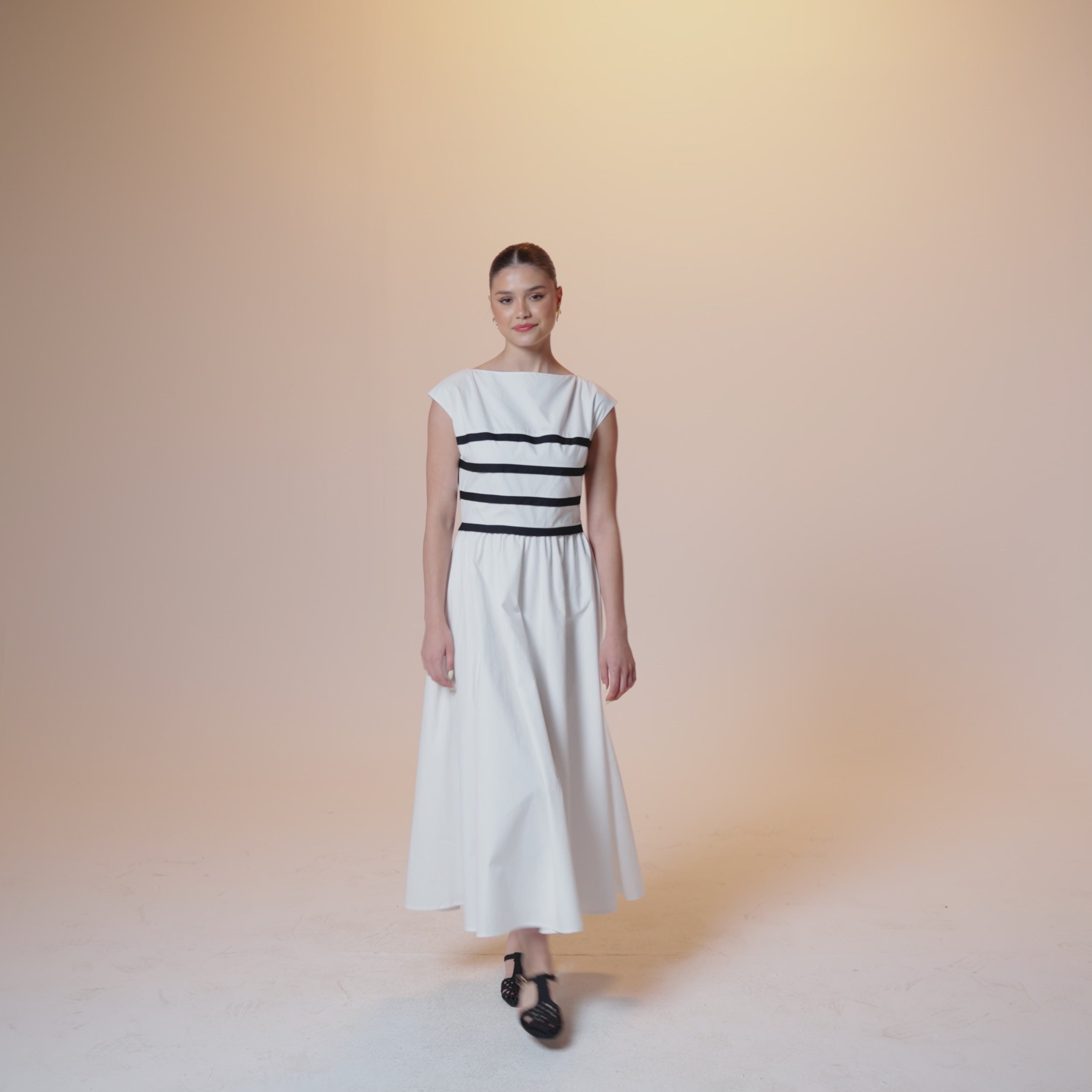 The Poplin Striped Flared A-Line Midi Dress from our Summer 2025 Collection. Designed with a round neckline and short cap sleeves, this dress features black self-fabric strap panels that add structure and edge.