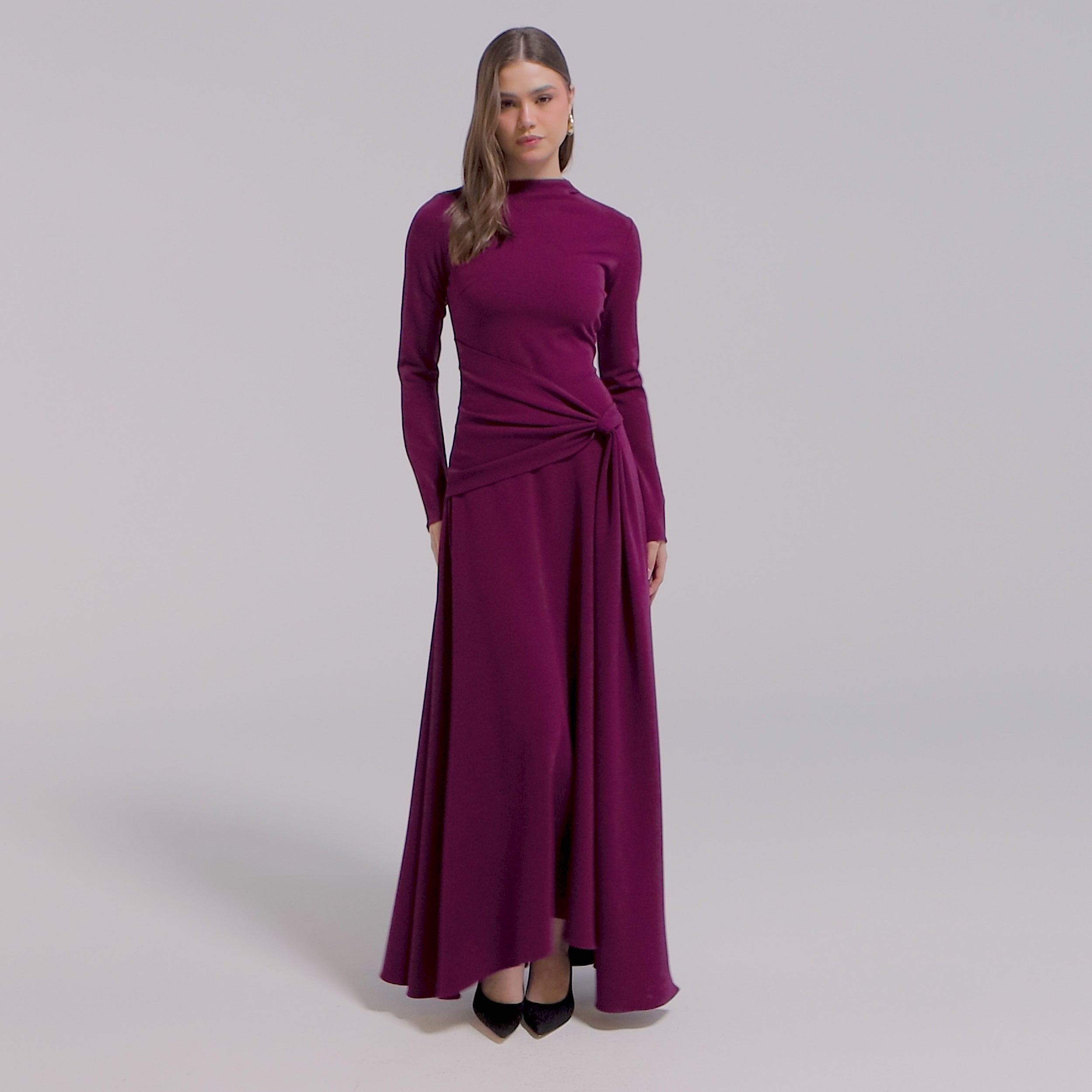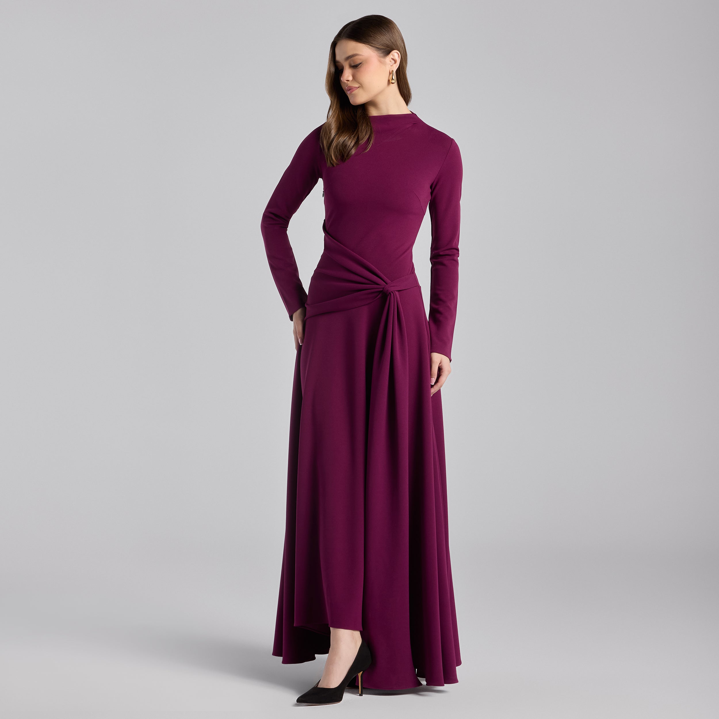 This crepe maxi dress is designed with a draped asymmetric neckline that adds interest without feeling exposed, while the soft crepe fabric follows your shape comfortably. The gathered detail at the waist creates gentle definition, making it a reliable choice for long evenings and formal gatherings.