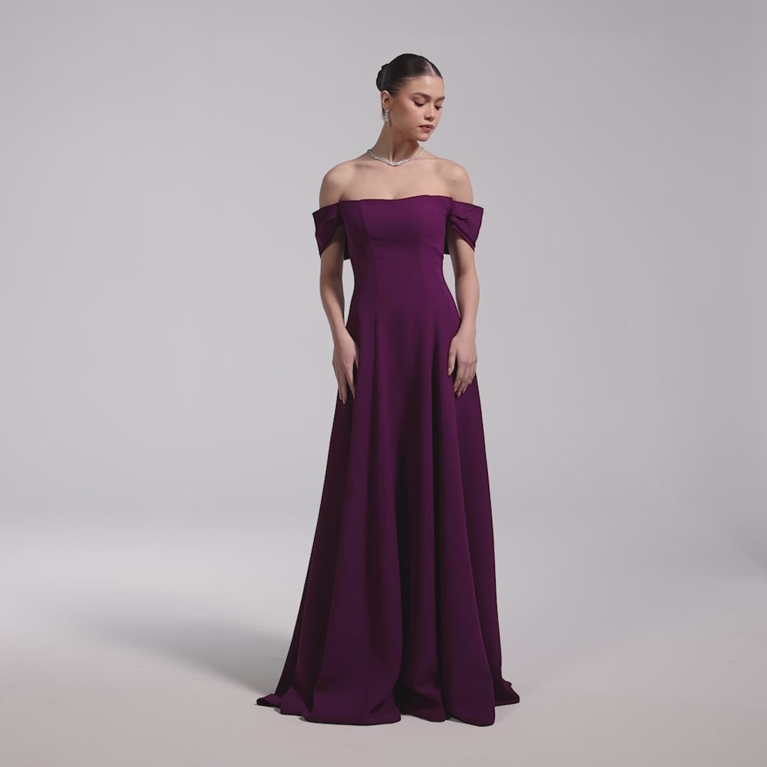 This off-shoulder crepe gown is a great choice if you want something elegant that still feels comfortable for long evenings. The structured bodice gives a clean, flattering look without feeling tight, while the off-shoulder sleeves add a soft touch that suits family events, engagements, and formal dinners.