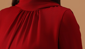 This high-neck maxi dress in crepe georgette is a statement of soft strength. Gently gathered at the chest, it features ultra-long flared sleeves with high slits for fluid movement, while back scarf panels extend from the neckline for an added sense of motion. A teardrop button closure at the back completes the silhouette with refined simplicity.