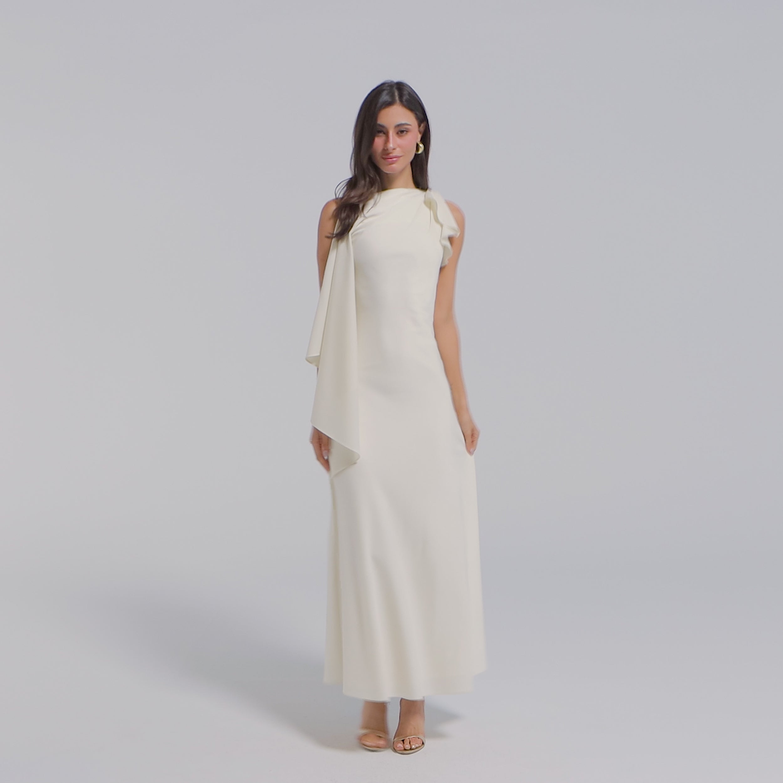 This dress is sleek but still easy to wear. The draped satin top with a boat neckline feels soft against the skin, while the fitted bodice and low waist open into a flared skirt that moves gracefully. A scarf detail draping from one shoulder adds subtle drama without extra fuss, making it an elegant choice for weddings, formal dinners, or special evenings.