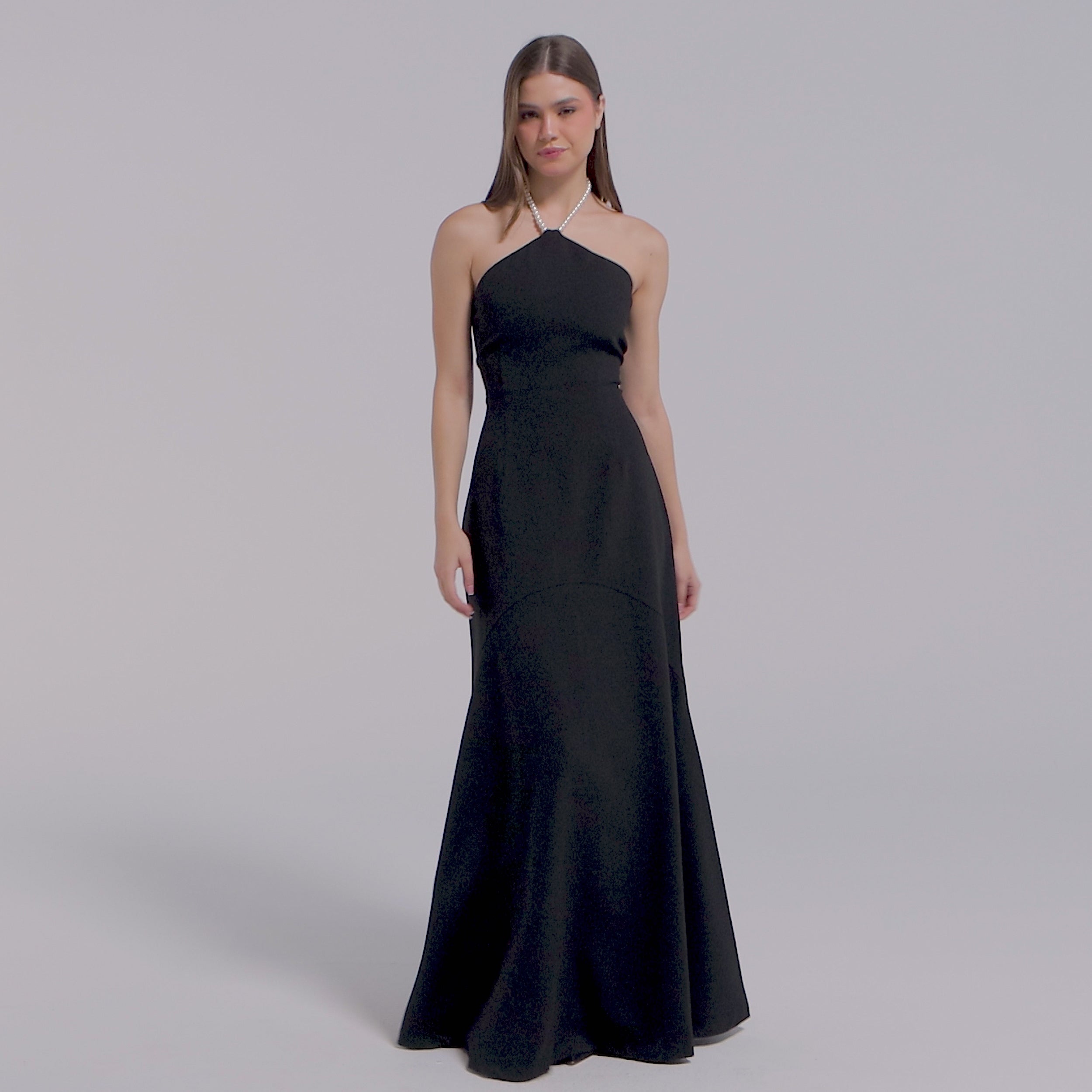 This black crepe halter maxi dress brings a modern take on classic evening style. The pearl halter neckline adds a refined touch, while the flowing crepe fabric gives an effortless, elongated shape. It’s an elegant choice for formal dinners, special occasions, or evening gatherings where comfort and sophistication matter equally.