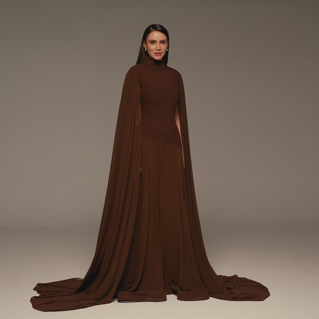 Brown Crepe & Chiffon Cape Sleeve Gown