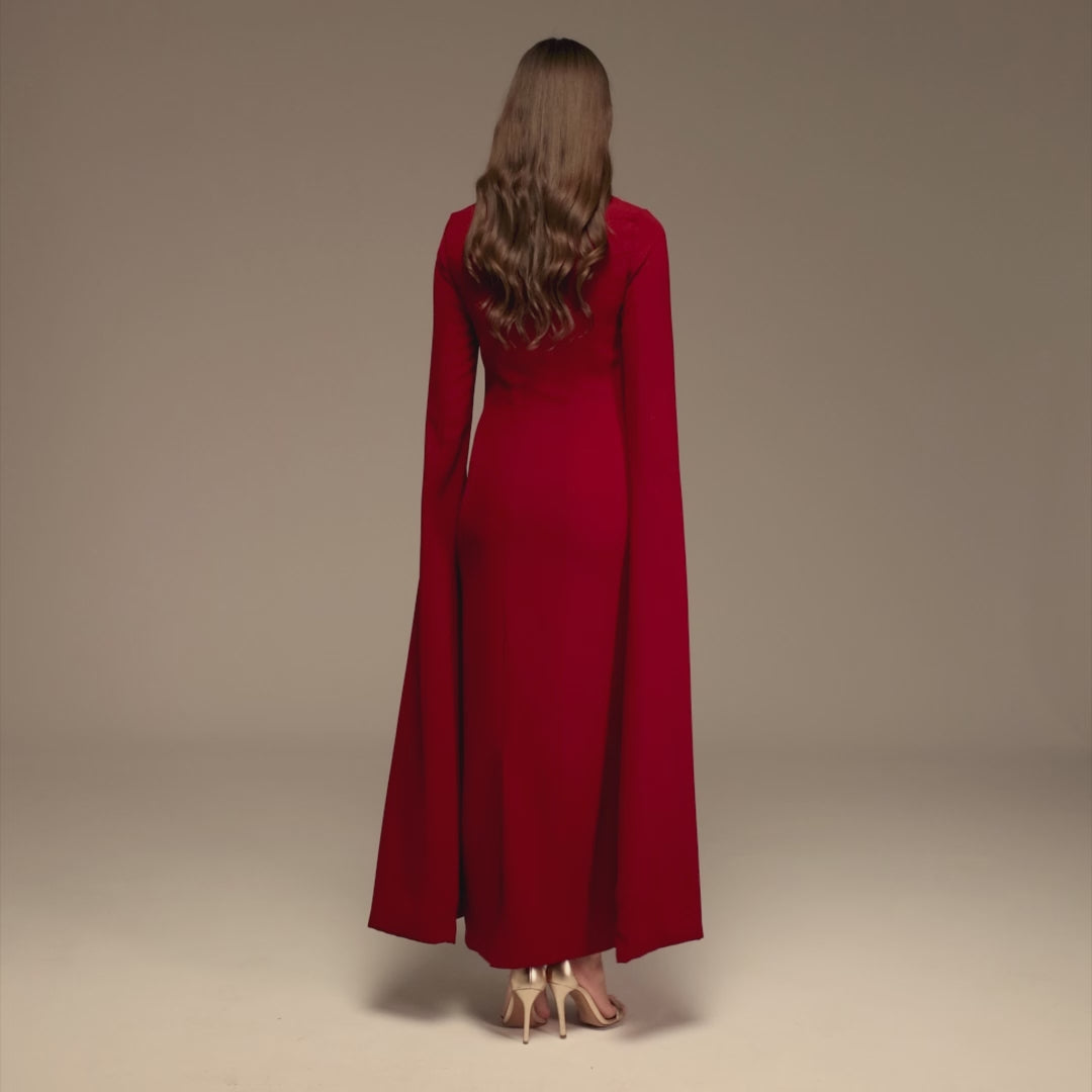 This maxi crepe dress features extra-long flared sleeves with deep slits at the cuffs, creating soft, fluid movement with every gesture. The straight fit gives a clean, elongating effect, while the high boat neckline frames the neck with quiet elegance. Fully lined for coverage and comfort, this piece moves gracefully from day to evening.