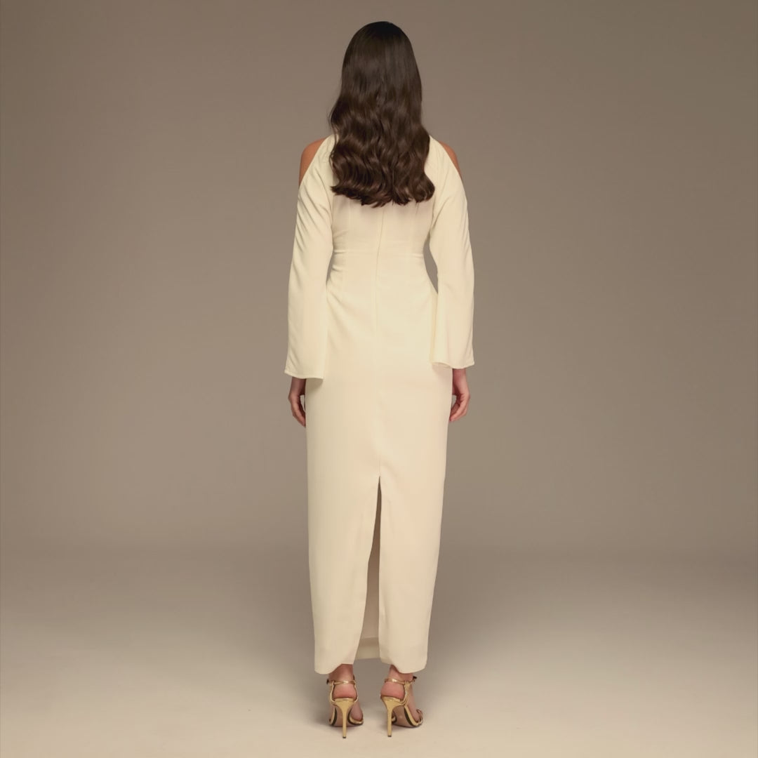A clean silhouette with unexpected detail. This crepe maxi dress features cut-out shoulders and a straight fit that skims the body without clinging. The high neckline balances the open shoulder design, making it suitable for both elevated daywear and formal evenings. The back slit ensures ease of movement despite the sleek shape.