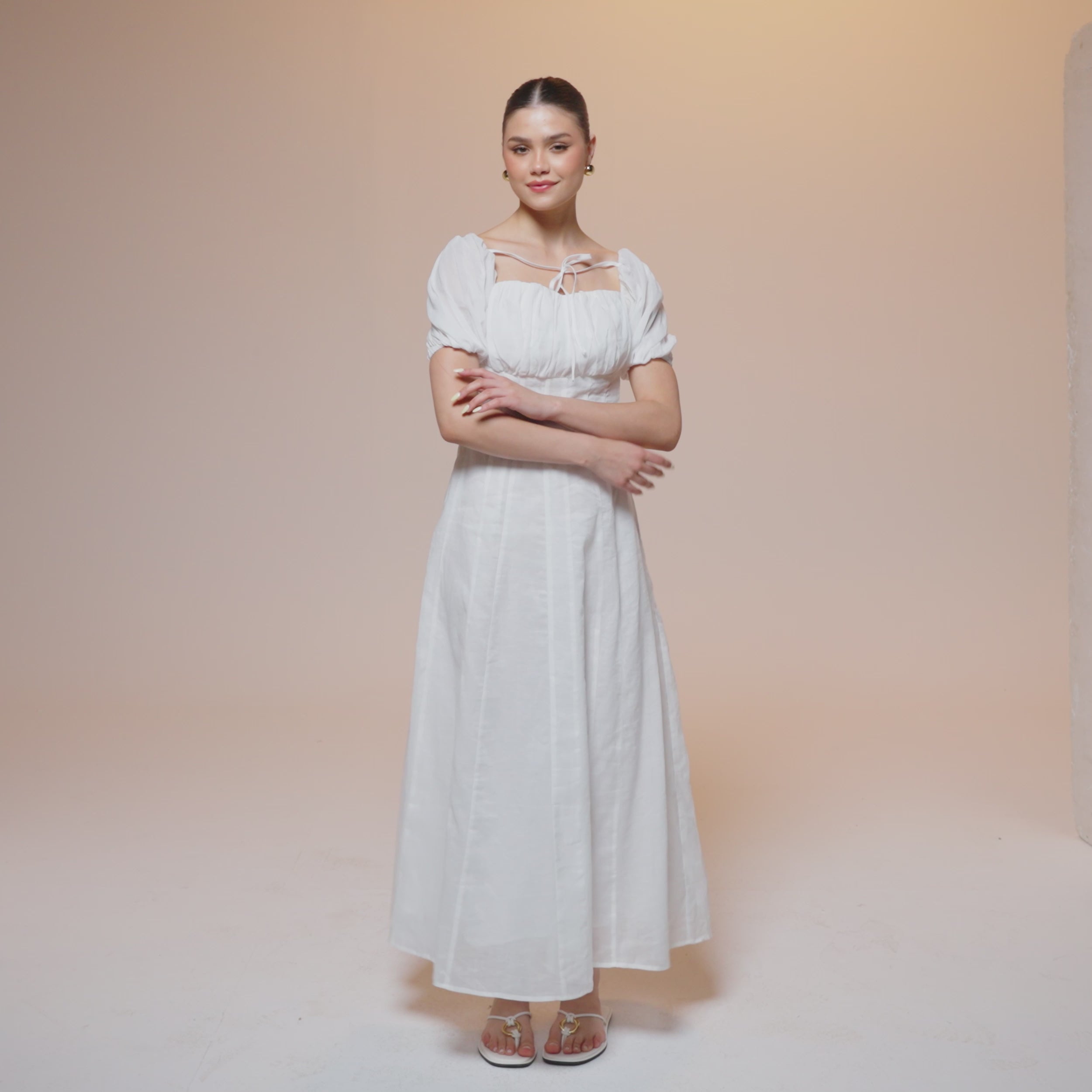 The Puff Short Sleeve Maxi Dress from our Summer 2025 Collection. Crafted from a breathable cotton blend, this flared maxi silhouette features a pleated chest, a delicate front tie, and voluminous short puff sleeves for a charming, airy look.