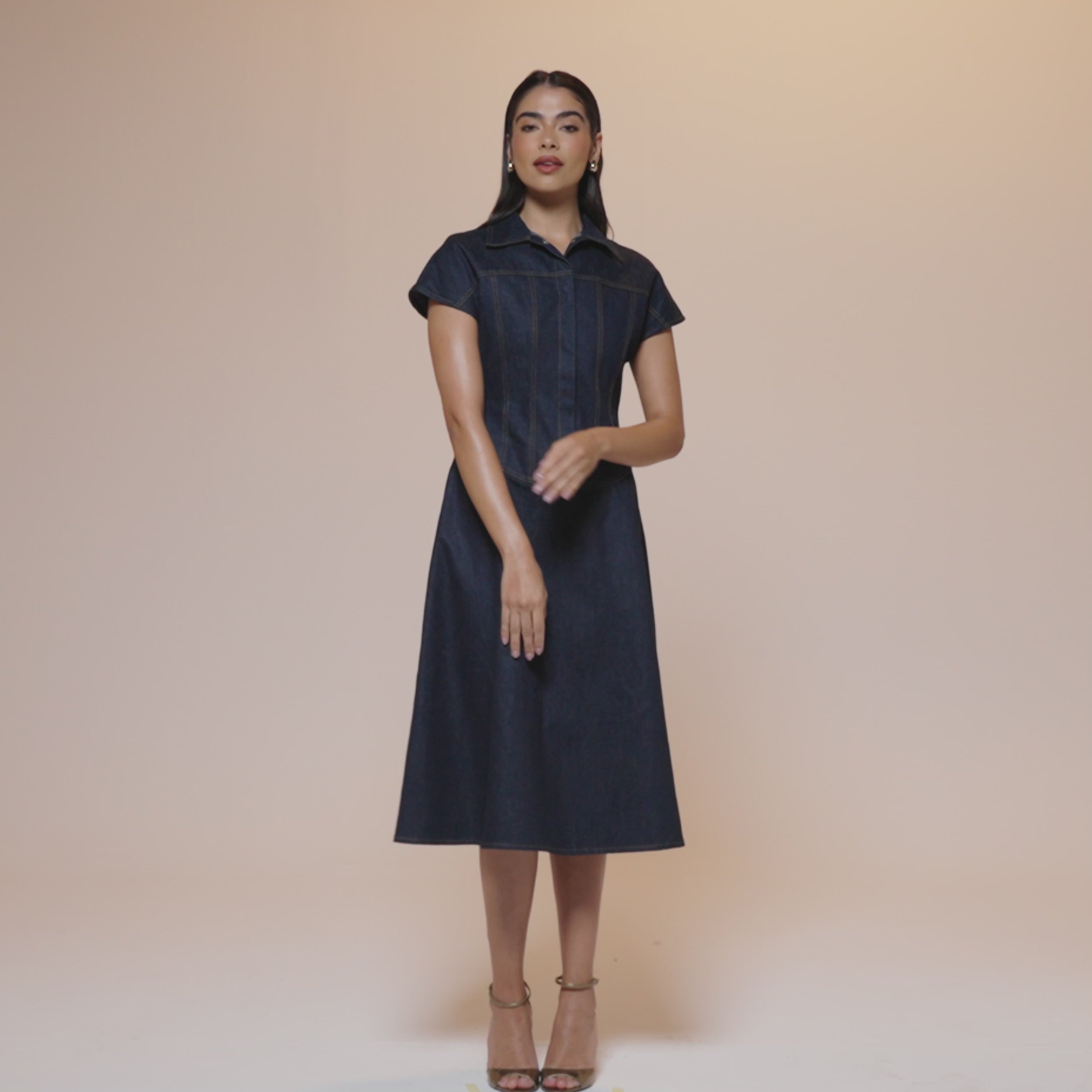 The Denim Short Sleeve Midi Dress from our Summer 2025 Collection. Designed with a classic collar, dropped shoulder sleeves, and chest stitching detail, this dress features an invisible placket and a flared circle skirt for a flattering, casual silhouette.