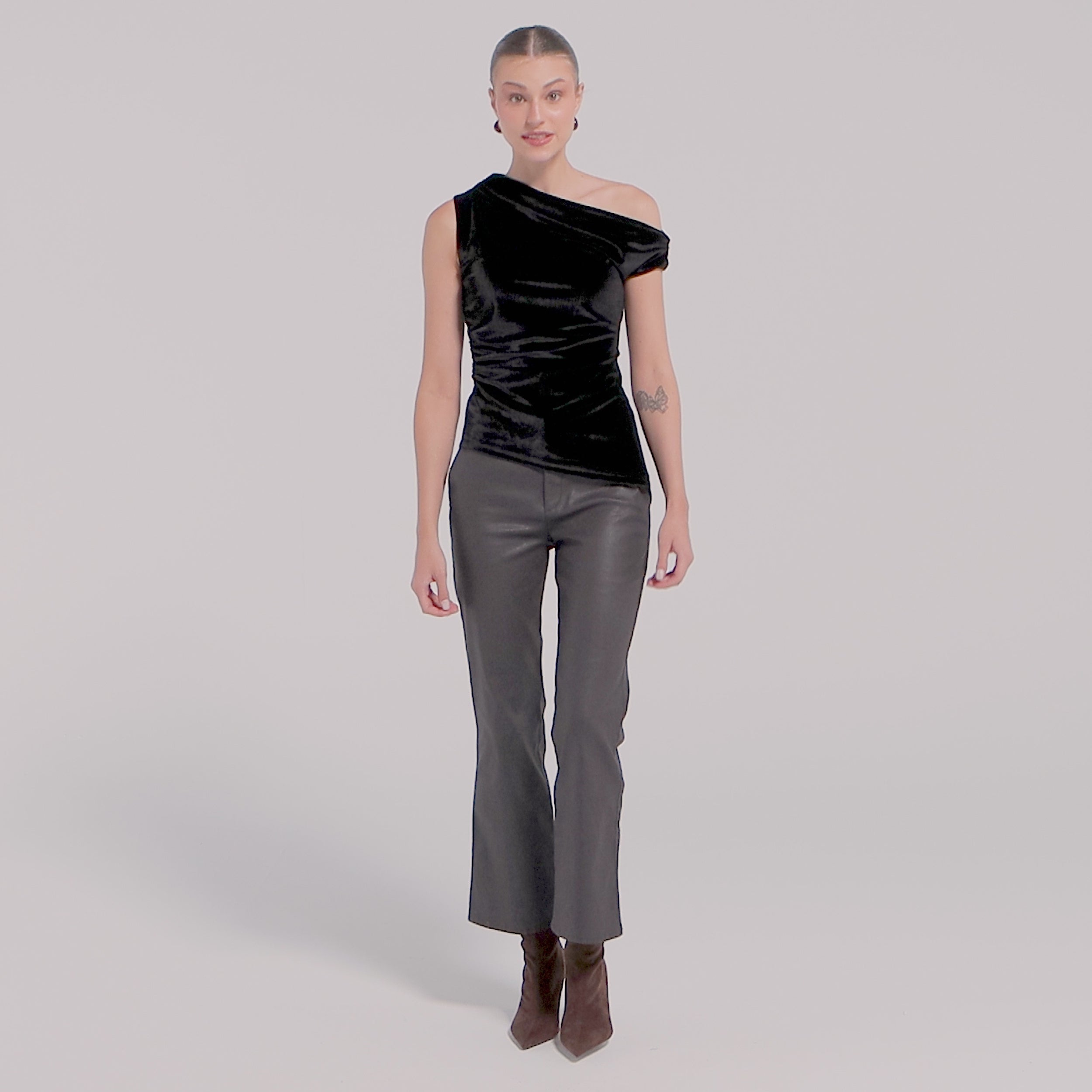 This top is sleek but easy to wear. The draped velvet design creates soft texture, while the off-shoulder cut on one side adds a modern twist without feeling overdone. The asymmetric hem flatters the waist and makes it versatile for pairing with skirts or tailored pants, perfect for dinners, weddings, or evening events.