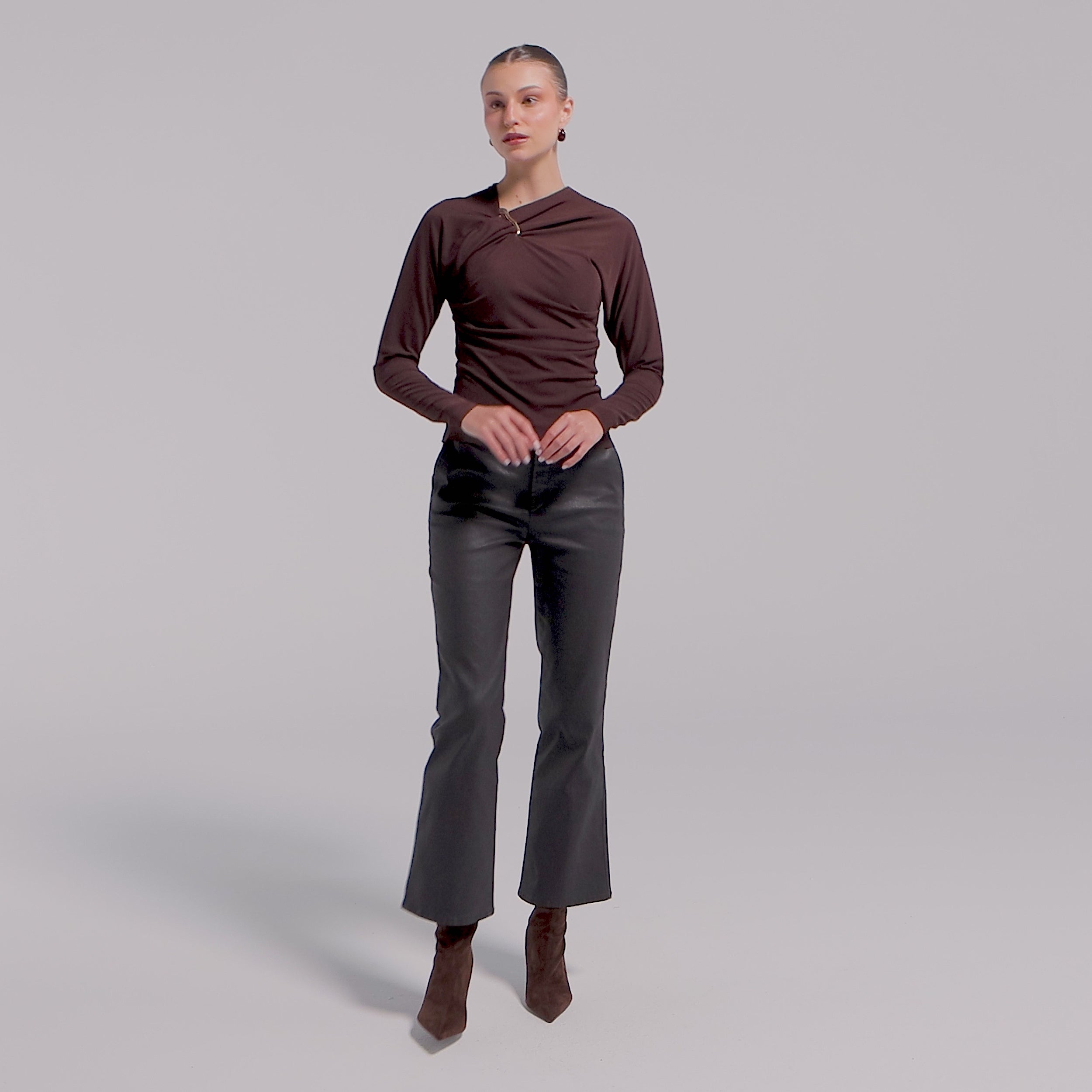 A soft jersey blouse designed with elegant drapes gathered at the neckline by a golden ring accent. The long fitted sleeves keep it sleek while the draped front adds just enough detail to make it stand out without feeling overdone. Lightweight and easy to style, it’s the kind of blouse that works for dinners, evenings out, or even dressed up for a special occasion.