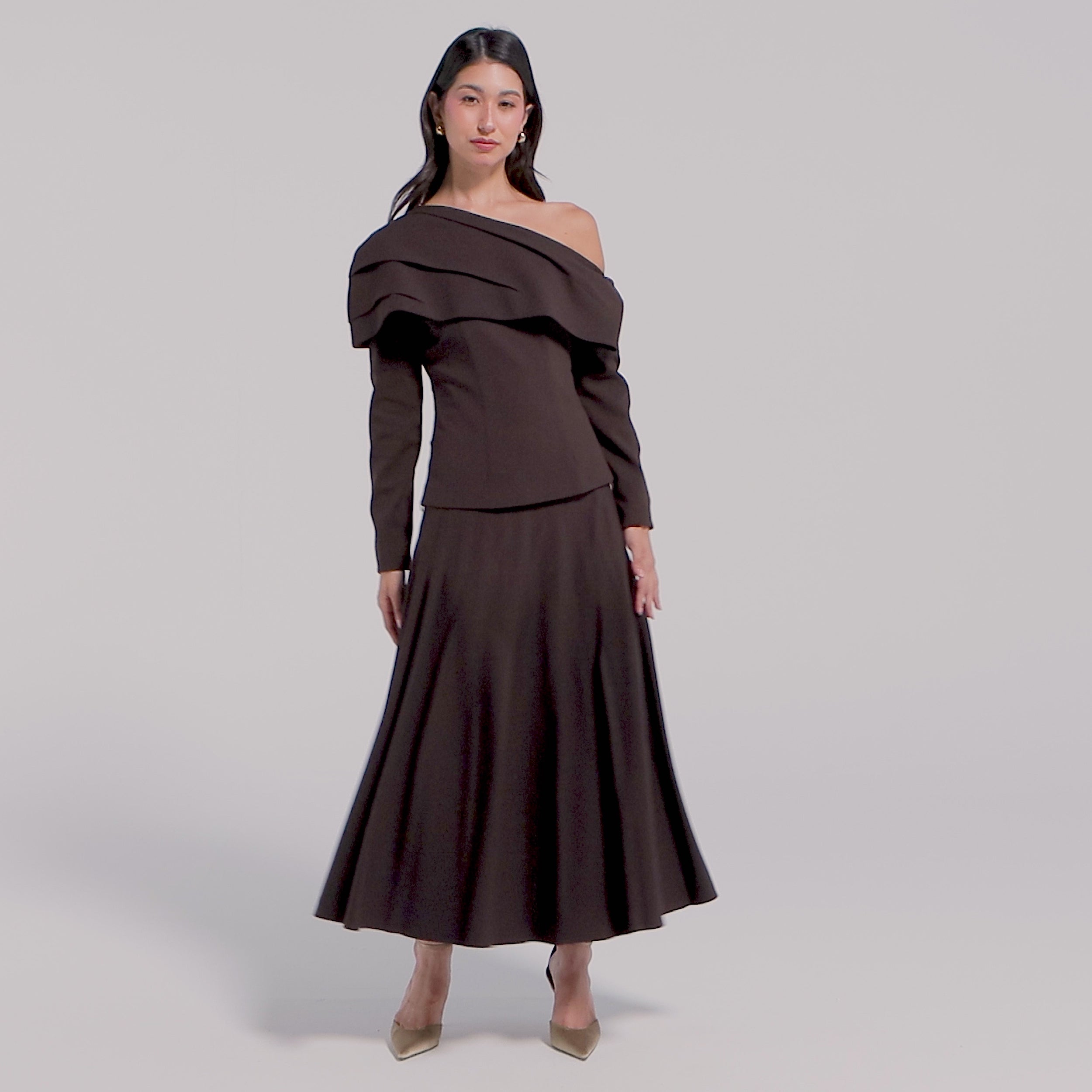 This off-shoulder crepe top blends structure with fluid draping, giving a refined yet modern feel. The folded neckline frames the shoulders beautifully, while the fitted waist creates a flattering silhouette that’s easy to style for both formal and semi-formal settings.