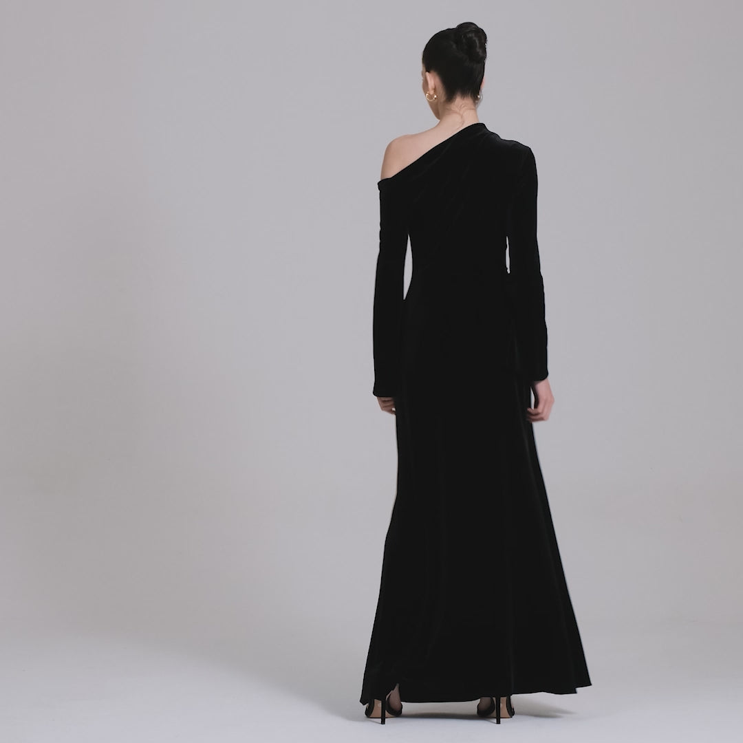 This velvet maxi dress combines a sleek straight cut with the elegance of a draped neckline that falls into one bare shoulder. The fitted waist enhances the figure, while the soft bell sleeves add a refined touch. Ideal for evening gatherings where sophistication meets comfort.