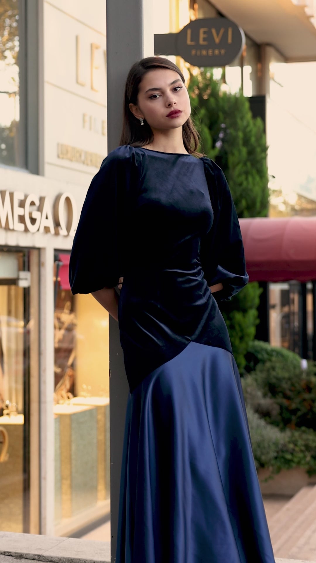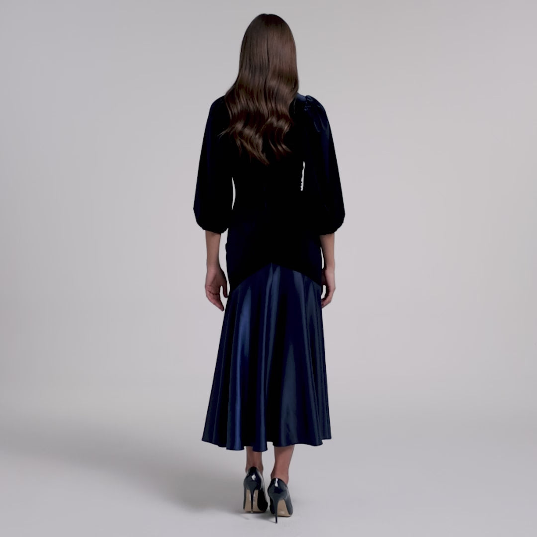 Blending soft volume with sculpted shape, this midi dress features a stretch velvet bodice and contrast satin skirt that begins at the hip for a clean separation of textures. The round boat neckline and balloon-style long sleeves provide coverage with modern elegance, while the flared satin skirt ensures ease of movement and balanced proportion. Ideal for women seeking a modest silhouette that still feels updated and refined.